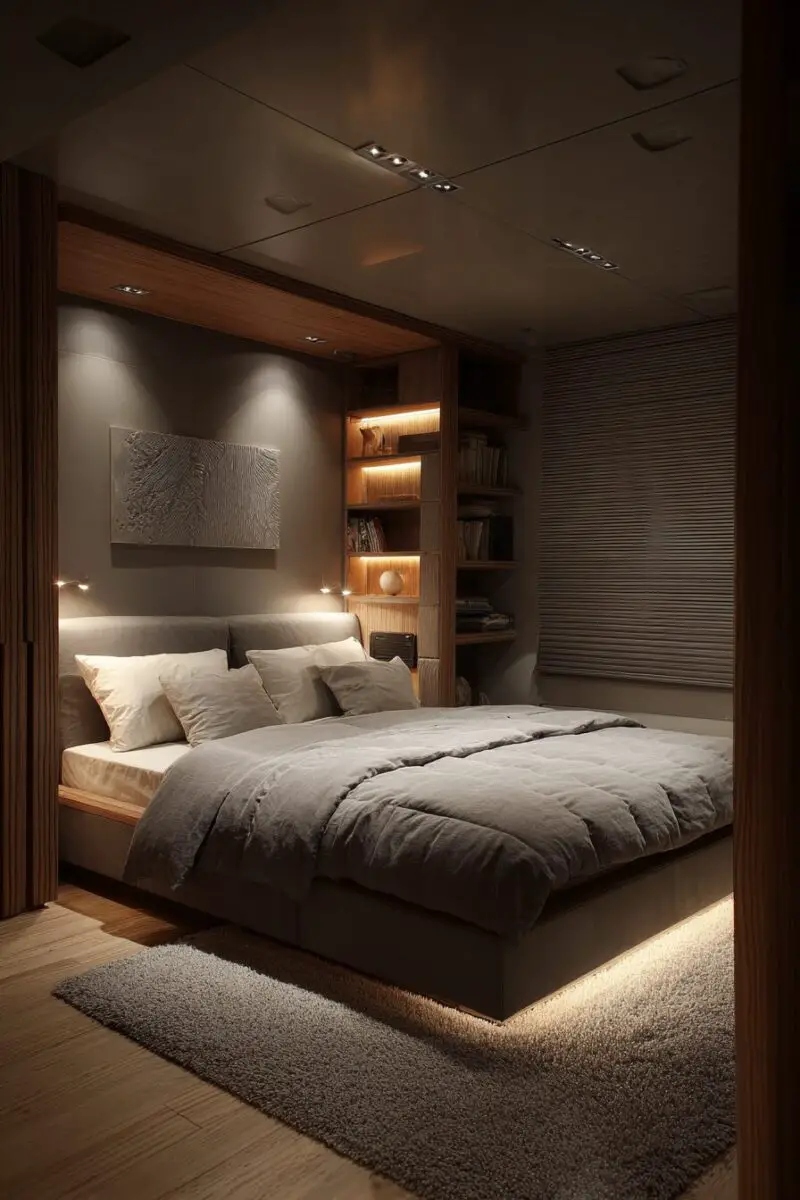 You run LED strip lights behind the headboard or under the bed frame to cast a subtle glow from beneath.
