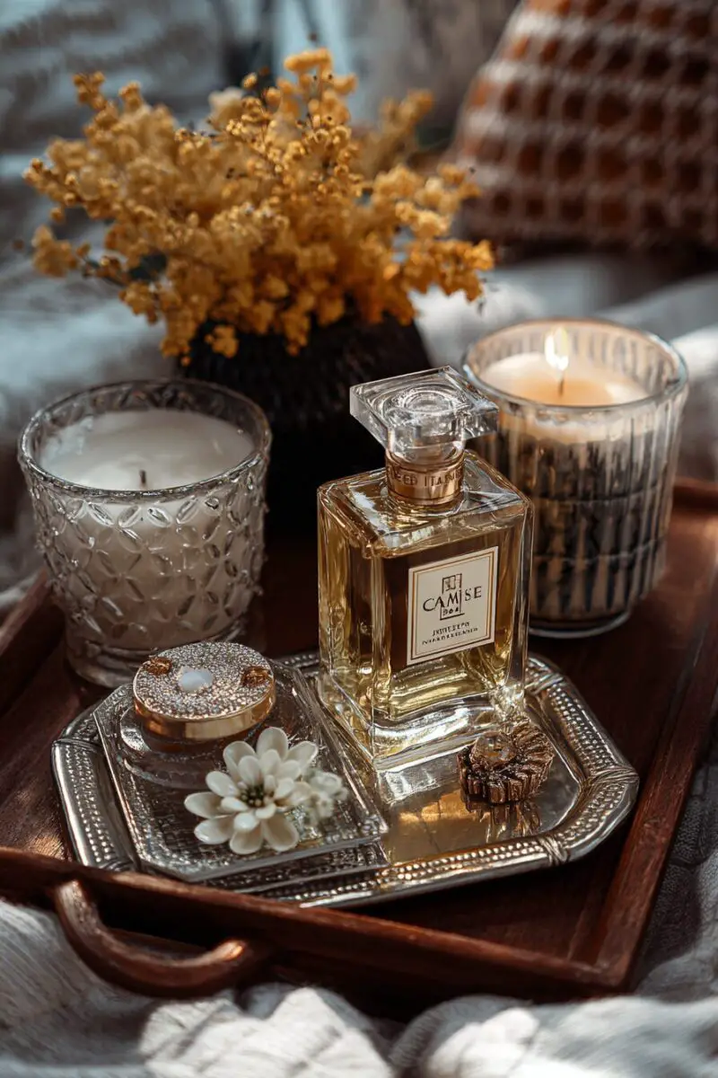 You include a bowl of fresh flowers or a small potted plant to naturally support the scent and bring life to the room.