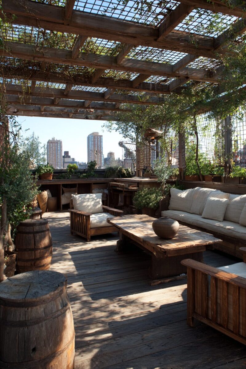 Reclaimed materials and nostalgic elements can create a rooftop space that feels like a charming countryside retreat transported to the city.