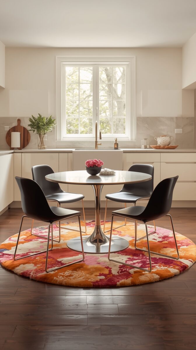 Go for a rug that’s at least 24 inches larger than your table diameter on all sides.
