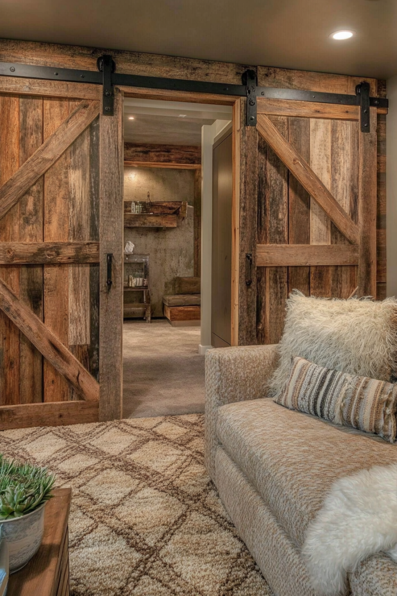 Barn doors work especially well if your basement has multiple entry points or needs a visual divider without the bulk of traditional doors.