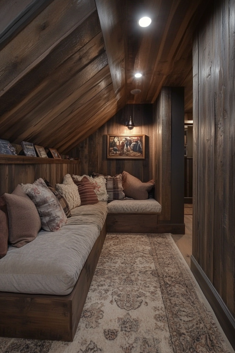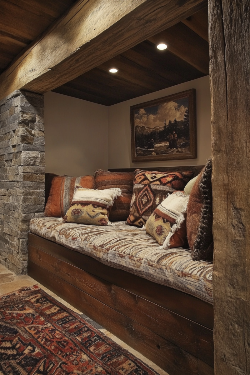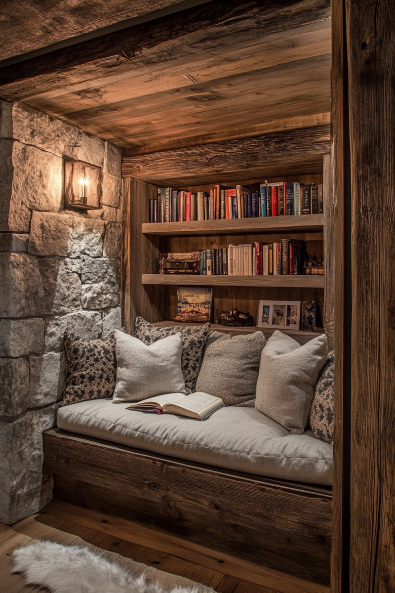 Every rustic basement needs a cozy corner where you can relax and unwind, and a reading nook is the perfect solution.