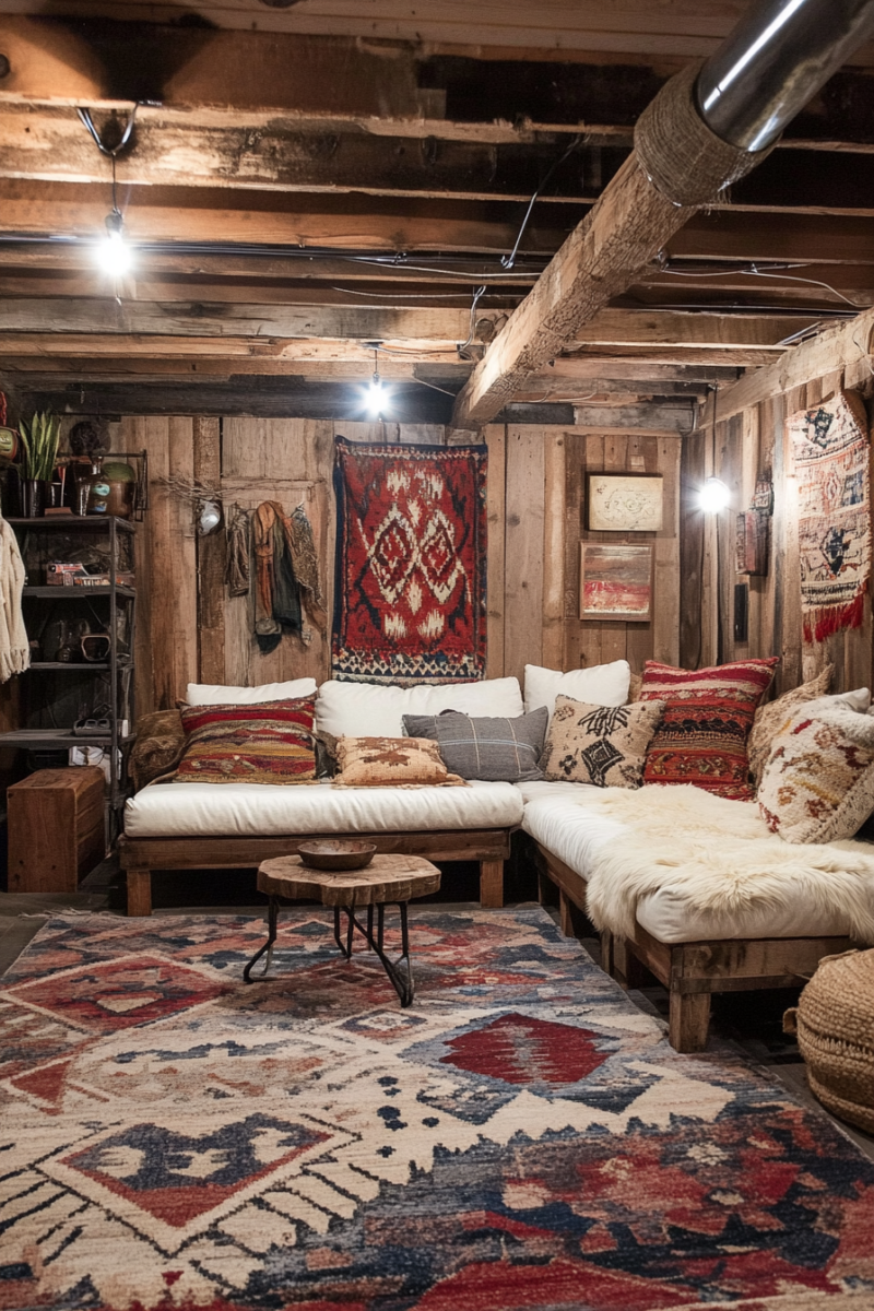 Adding rugs and textiles is an easy way to soften the hard edges of a rustic basement.
