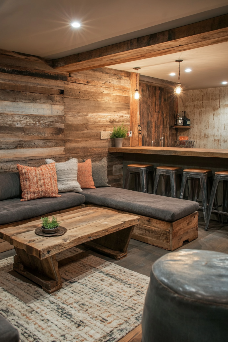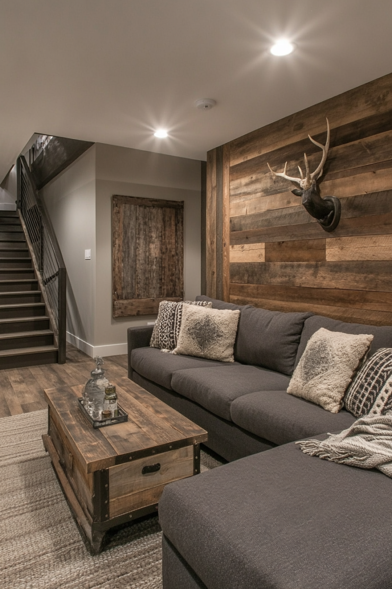 A reclaimed wood accent wall is a showstopper in any rustic basement.