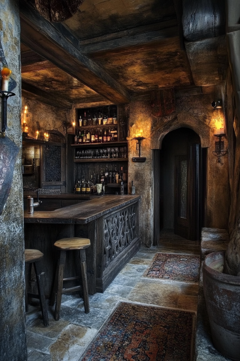 A wooden or stone bar counter is the foundation of this cozy corner.