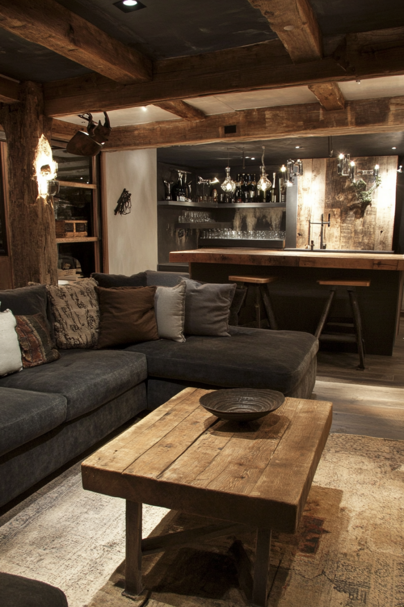 Accent the bar area with warm industrial lighting, such as pendant lights with metal shades or Edison bulbs.