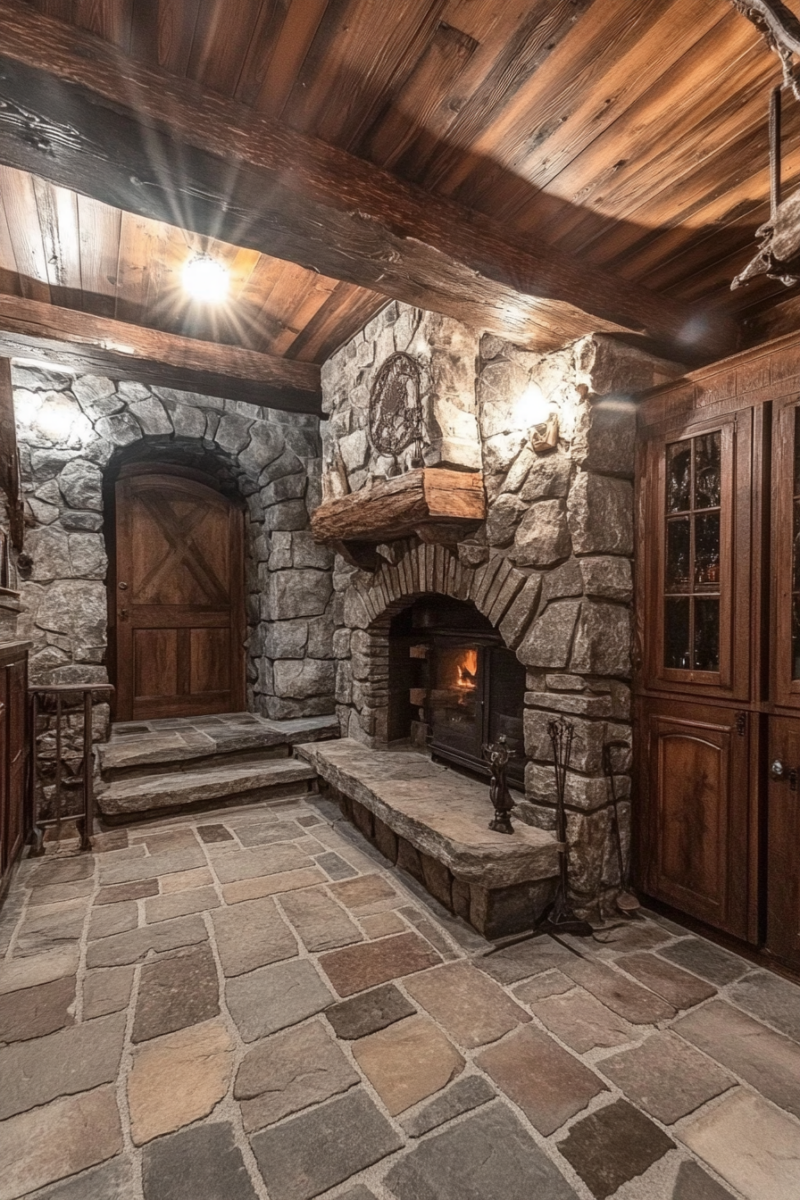 A stone fireplace is the ultimate centerpiece for a rustic basement.