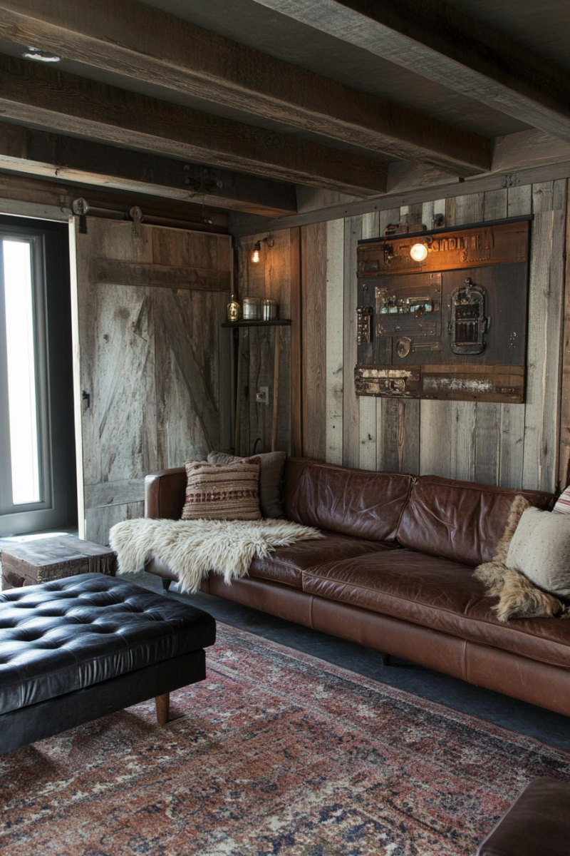 Accent walls made of reclaimed wood pair beautifully with leather furniture, cozy throw blankets, and textured rugs.