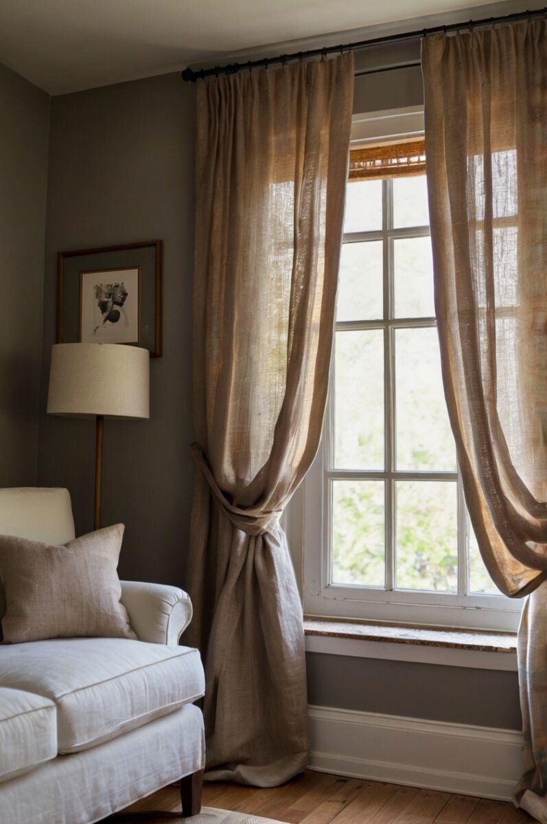 You can enhance the rustic feel with simple tiebacks made from twine, vintage buttons, or small sprigs of dried herbs or flowers.