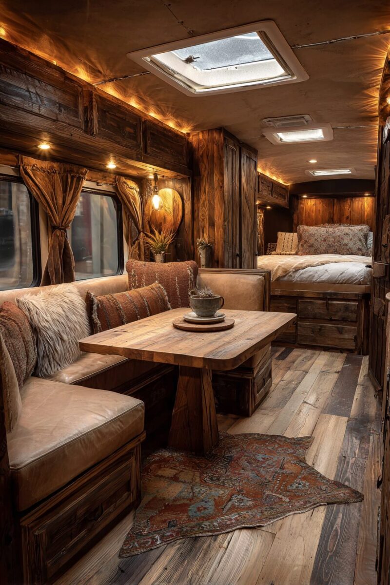 Wood paneling creates warmth and texture that makes your RV feel like a cozy cabin, especially when you choose reclaimed or weathered finishes that add character.