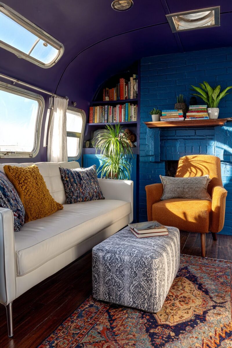 Painted accent walls in deep, rich colors like navy blue or forest green create intimate, cocoon-like feelings that make your RV feel like a luxury retreat.