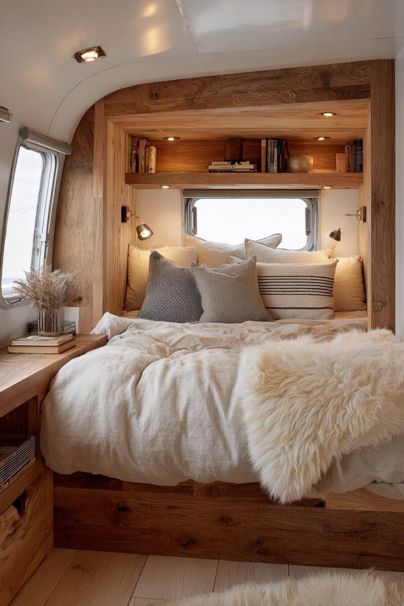 Natural wood furniture pieces add warmth and authenticity while often being more durable than manufactured alternatives for long-term RV living.