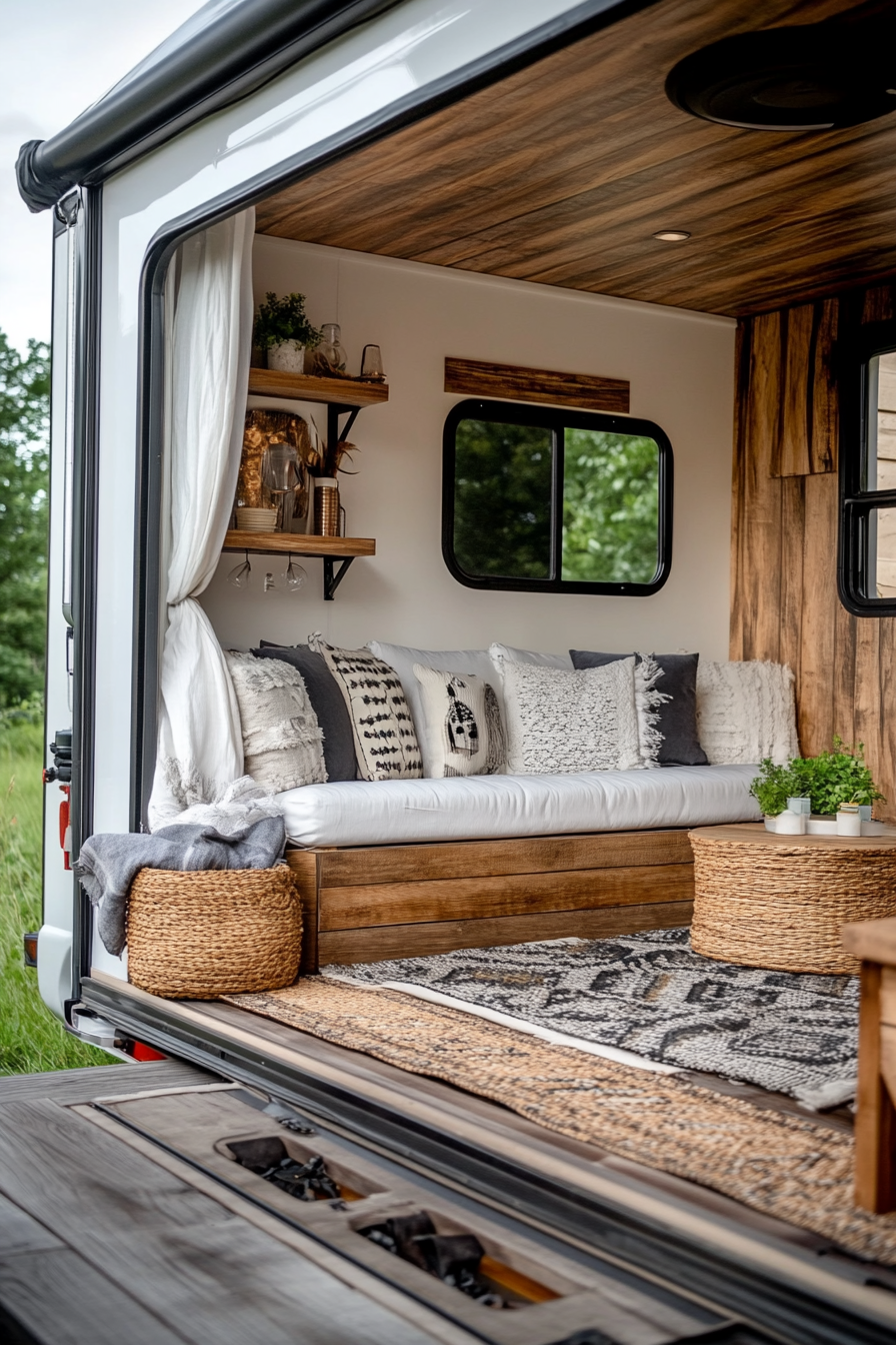 By maintaining a simple, light color palette, your RV living room will feel spacious, airy, and contemporary.