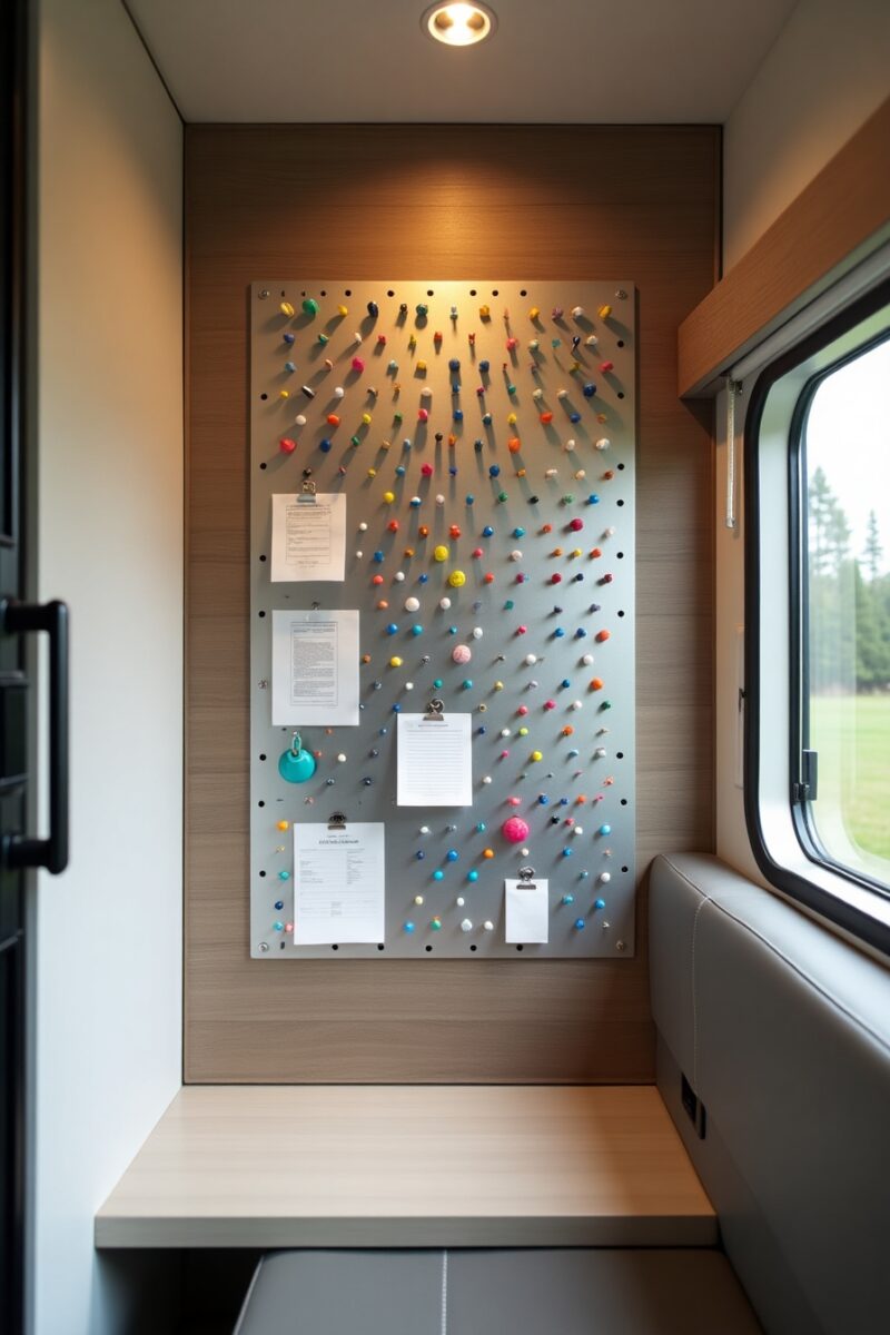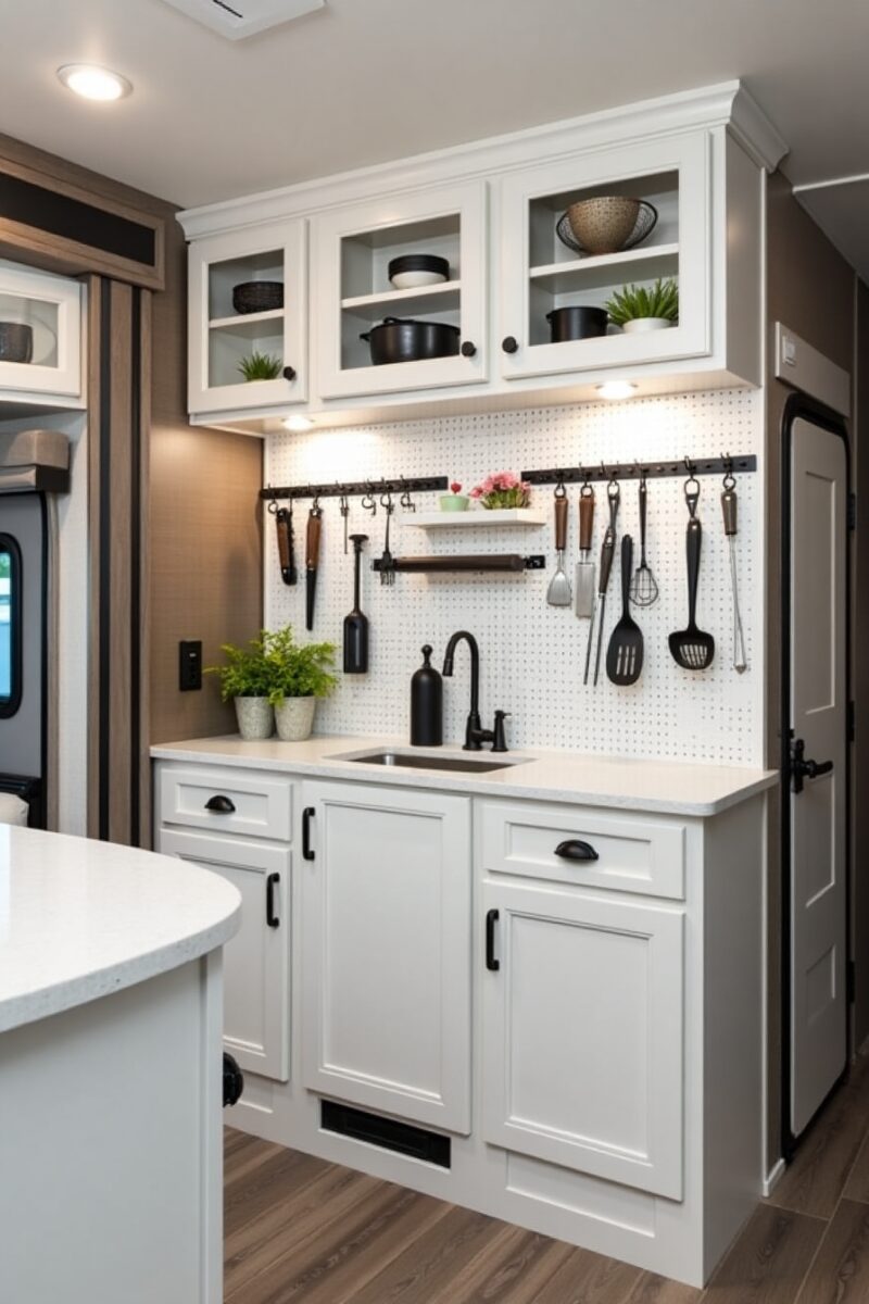 Custom-sized acrylic shelves that hook directly into pegboard create instant display areas for decorative items that make your RV feel like home without consuming valuable storage areas.