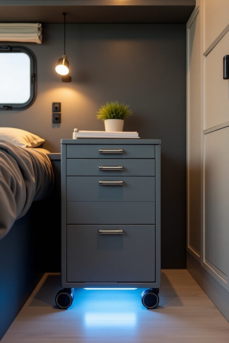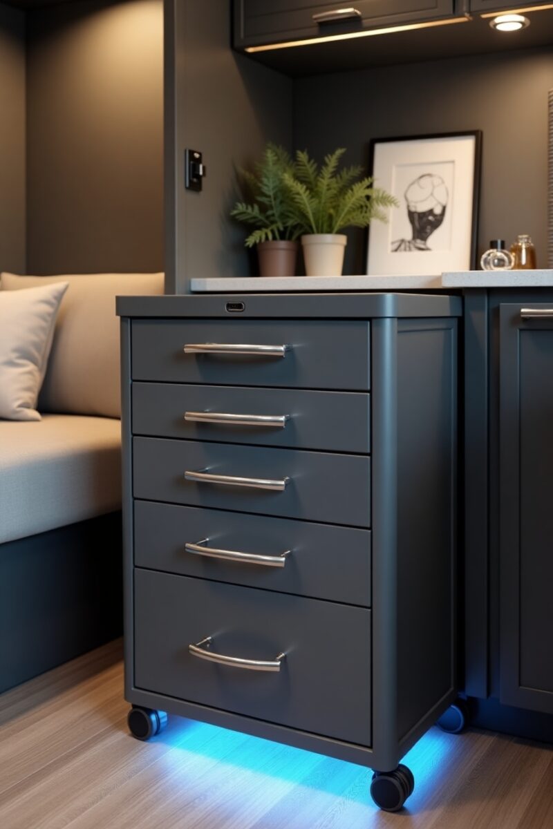 Narrow rolling carts with multiple drawers create instant storage that adapts to your changing needs throughout the day.
