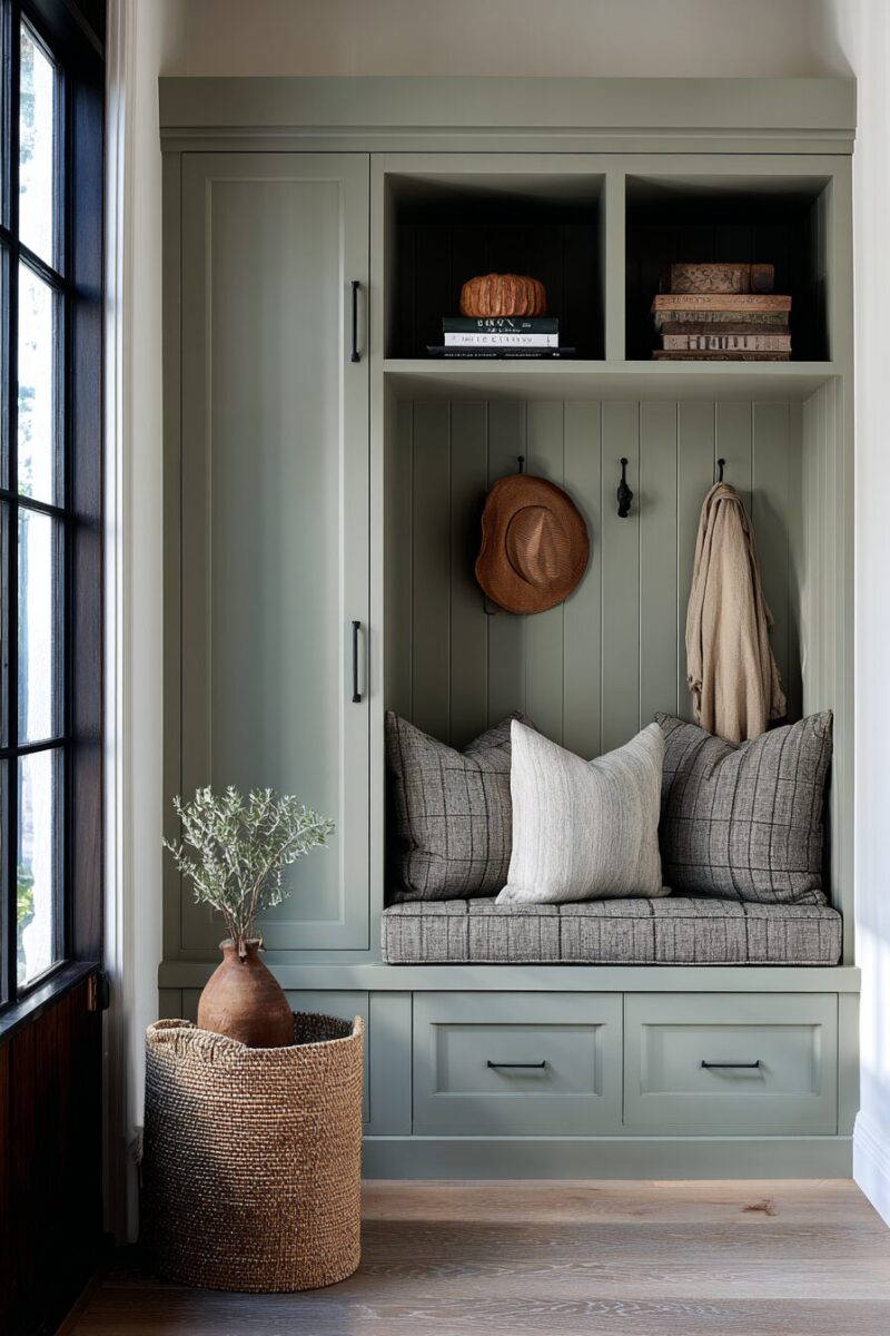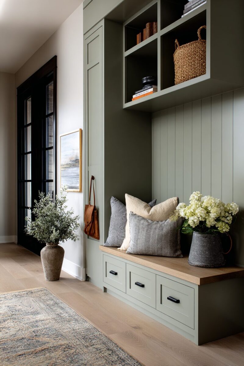 Add sage green throw pillows to any seating in your entryway, whether it’s a bench, chair, or built-in seating area.