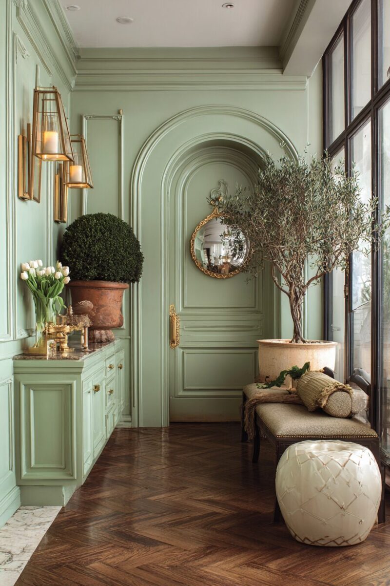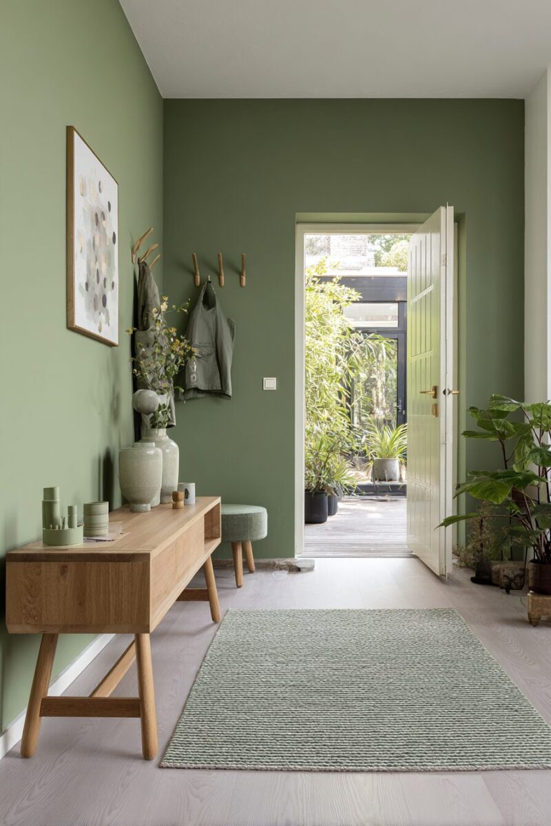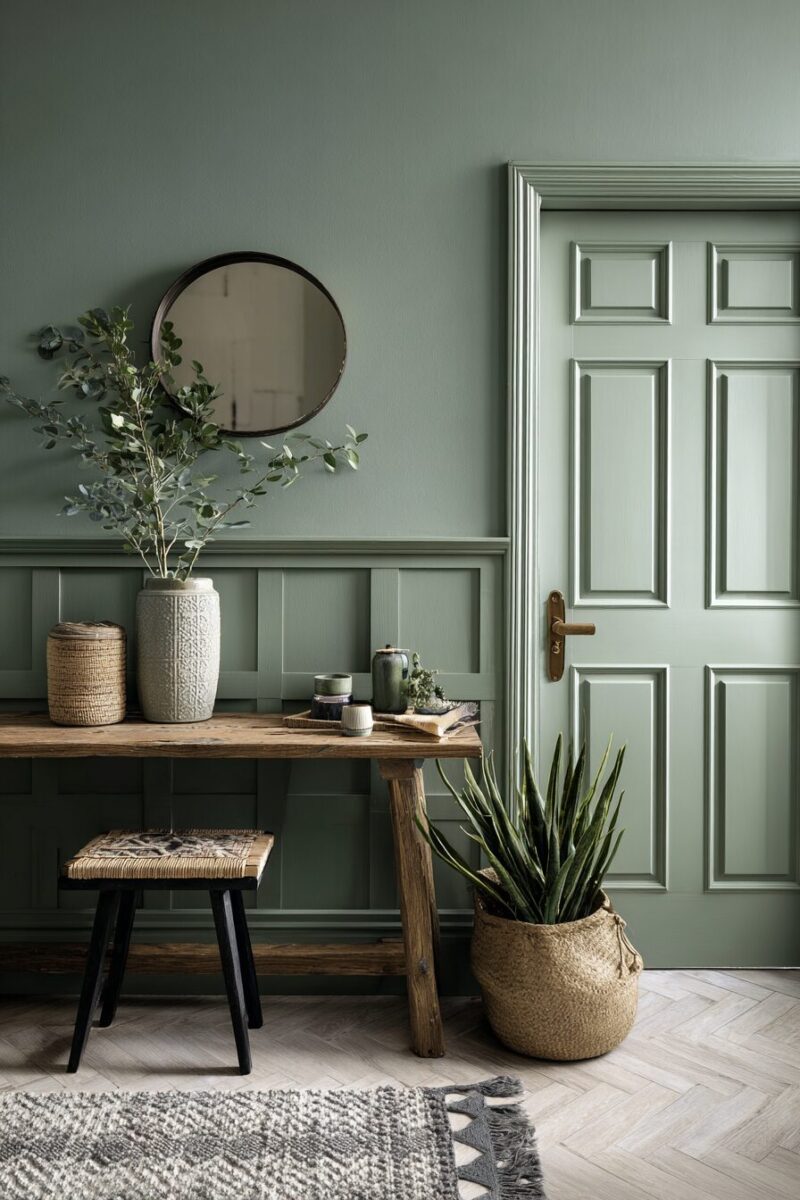 Pair your sage green accent wall with crisp white trim to create contrast and visual interest that draws the eye upward, making your entryway feel more spacious and grand.