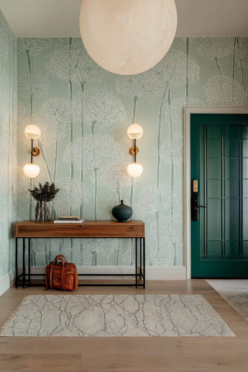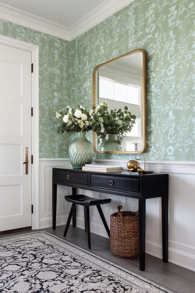 Sage green wallpaper with metallic accents like gold or silver adds glamour and reflects light beautifully, making your entryway feel more spacious and luxurious.