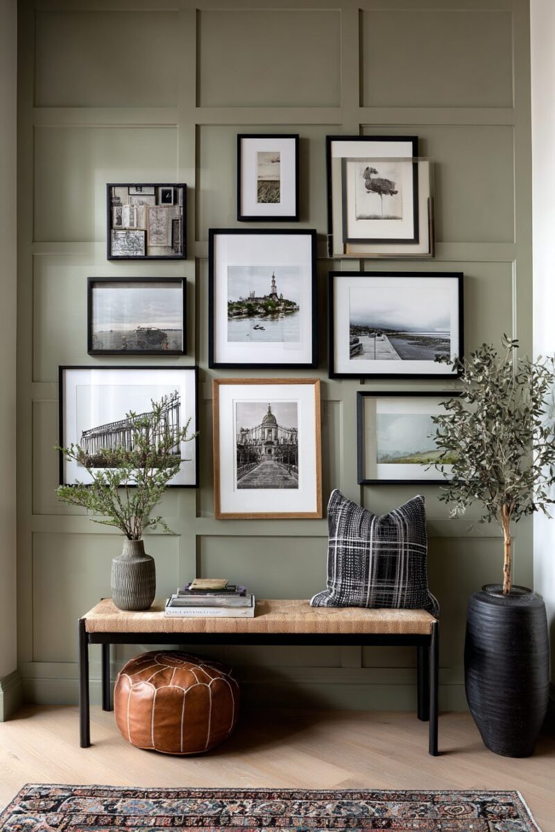 A thoughtfully curated gallery wall featuring sage green frames instantly transforms your entryway into a sophisticated space that showcases your personality and artistic sensibilities.