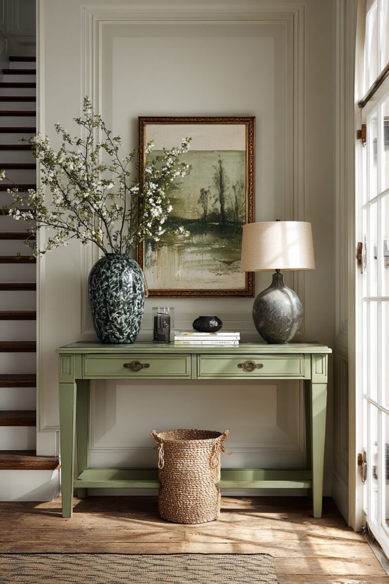 A vintage sage green console table serves as both a functional piece and a stunning focal point that immediately establishes your home’s welcoming personality.