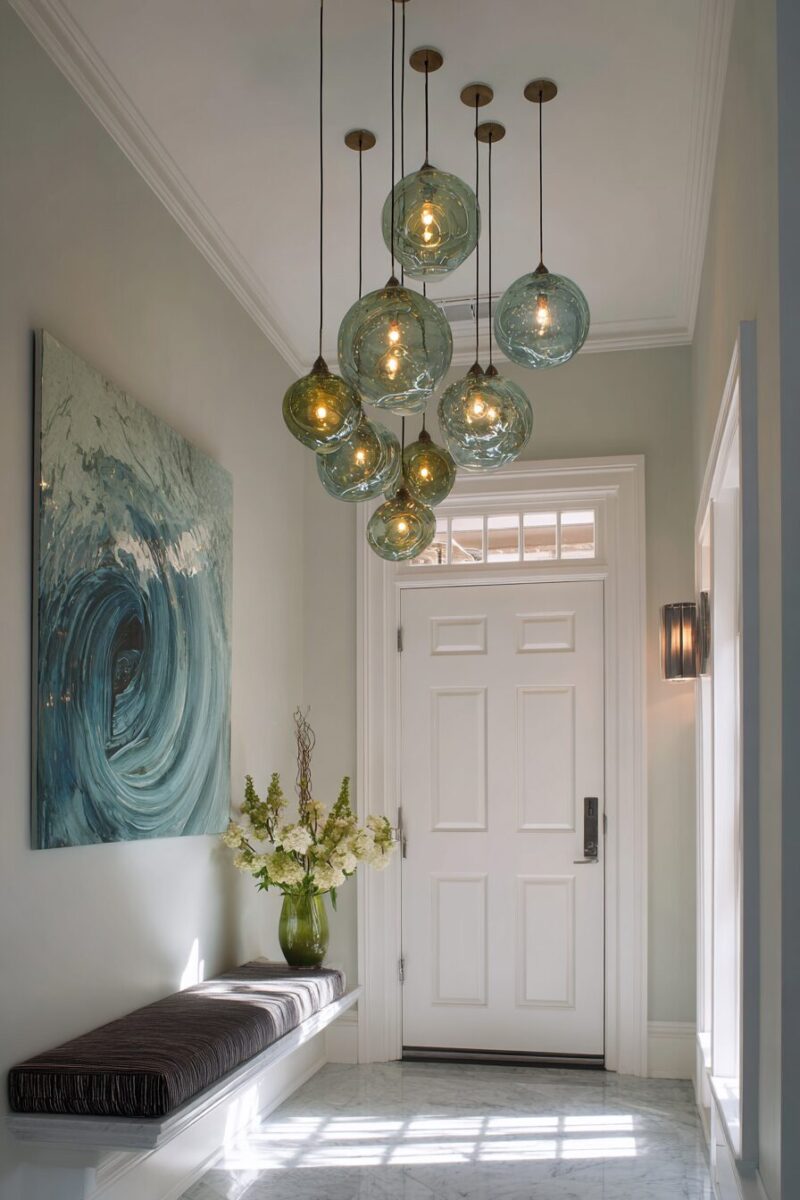 A statement chandelier or pendant light in sage green serves as a focal point while providing general illumination for the entire entryway space.
