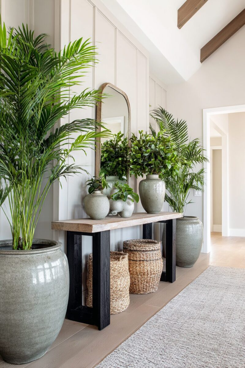 Seasonal touches like forcing bulbs in sage green pots during winter or adding seasonal herbs during growing months keep your entryway plant display fresh and ever-changing throughout the year.