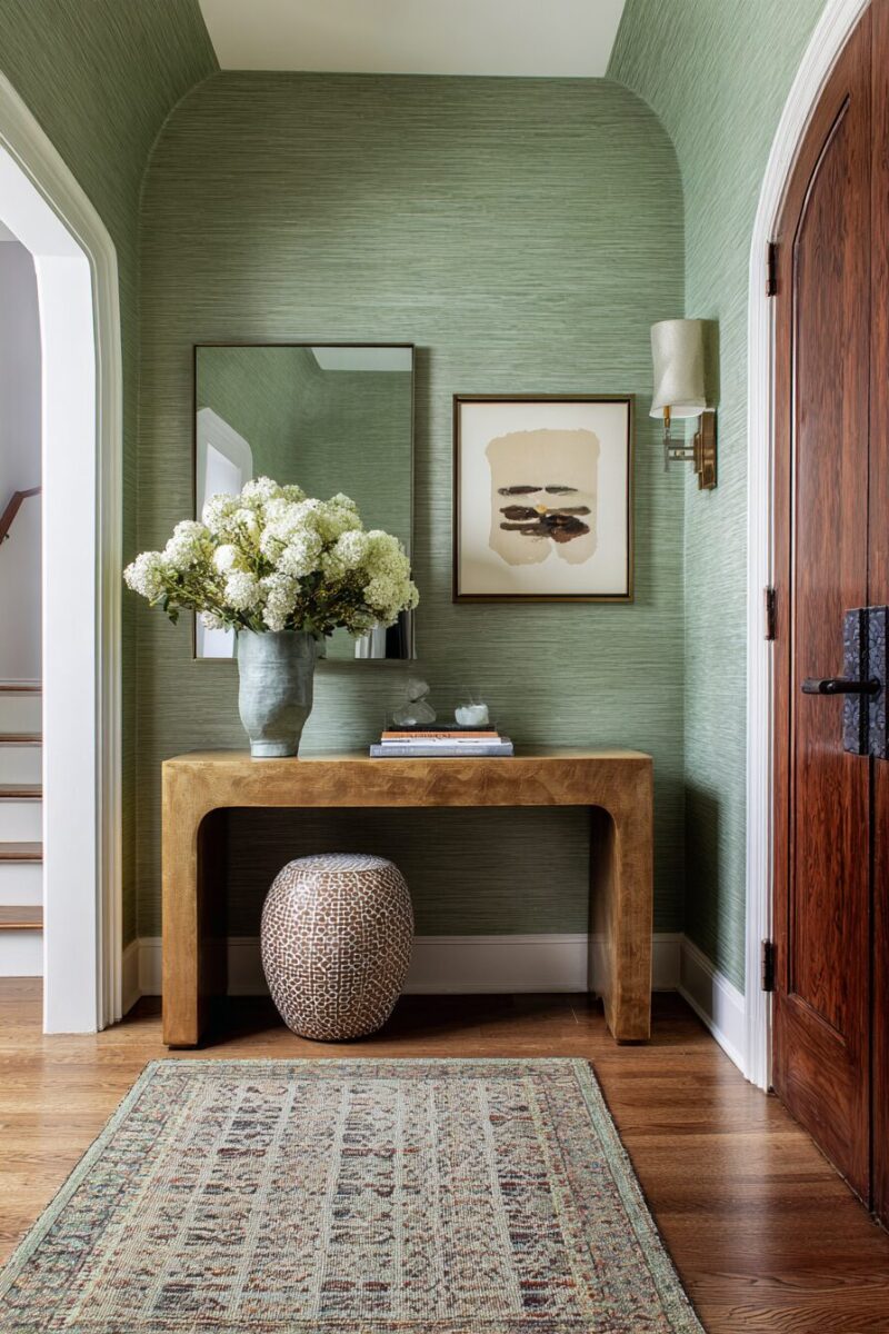 Sage green wallpaper creates instant drama and sophistication in your entryway while adding pattern, texture, and visual interest that paint alone simply cannot achieve.