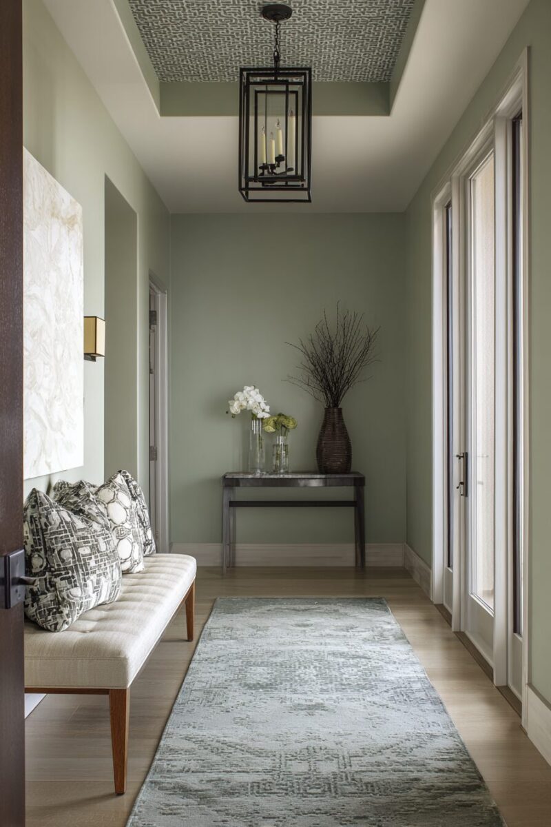 Incorporate sage green curtains or window treatments if your entryway has windows, choosing fabrics that filter light beautifully while maintaining privacy.
