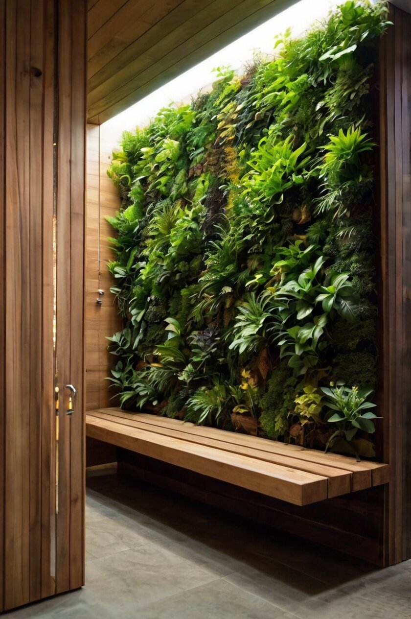 This design incorporates hydroponic or soil-based growing systems built directly into the sauna walls, creating a vertical garden that feels like stepping into a tropical rainforest.
