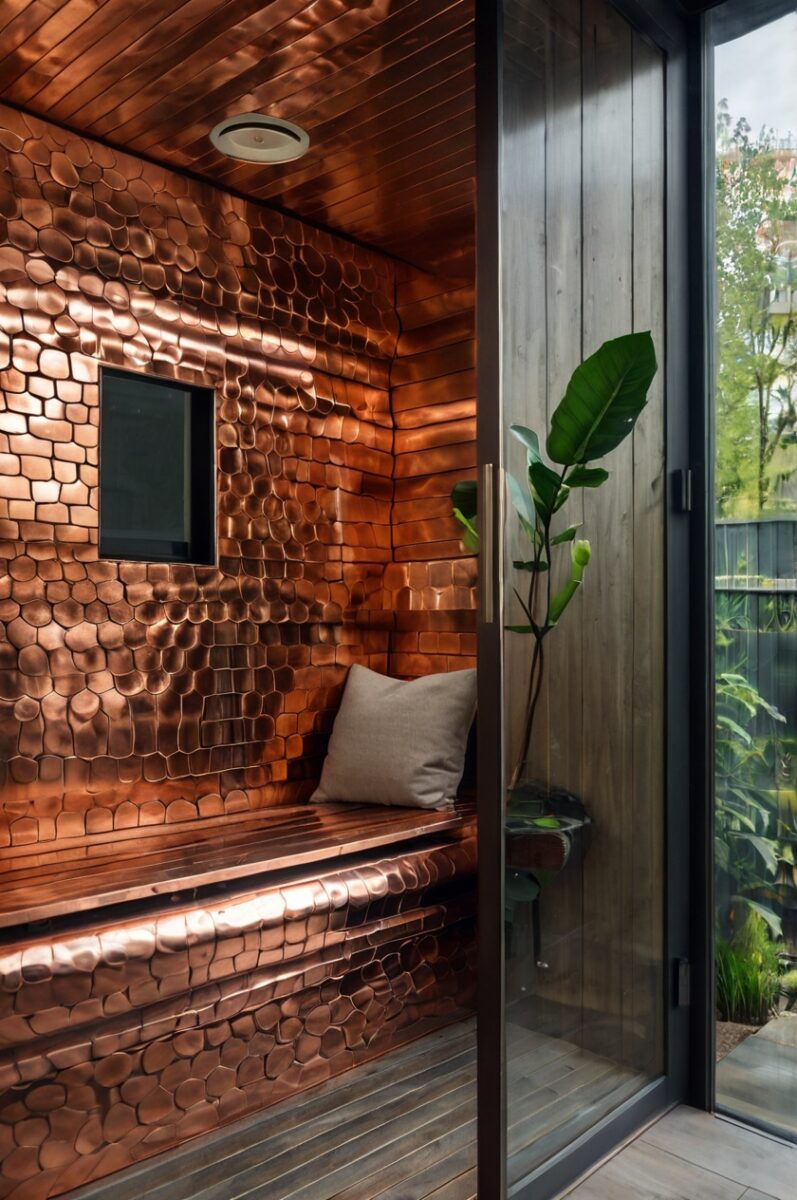 The patina development on copper surfaces creates a living finish that tells the story of your sauna’s use, with each session contributing to its evolving character.