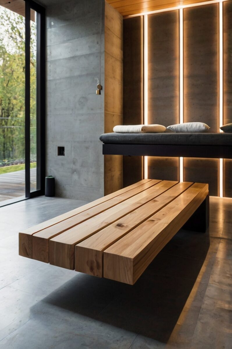 Revolutionize your sauna’s interior with sleek floating benches that appear to defy gravity while providing incredibly comfortable seating that looks like modern art.