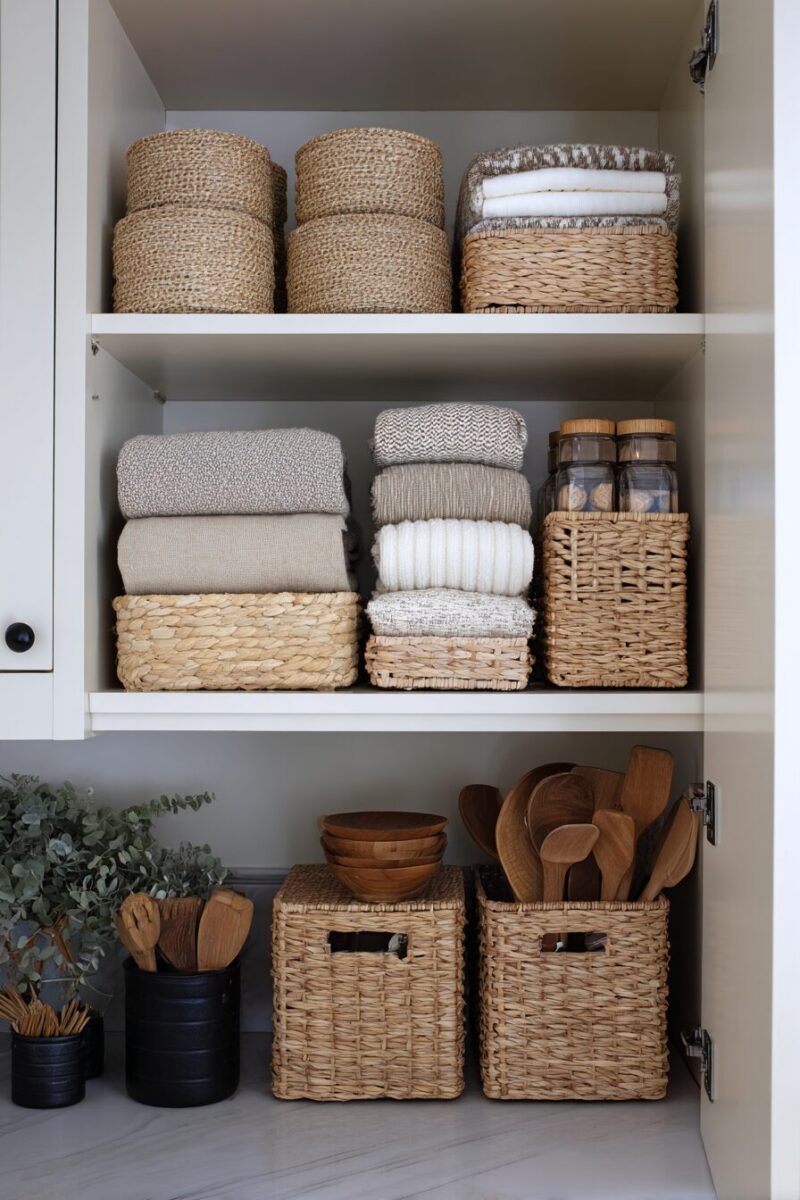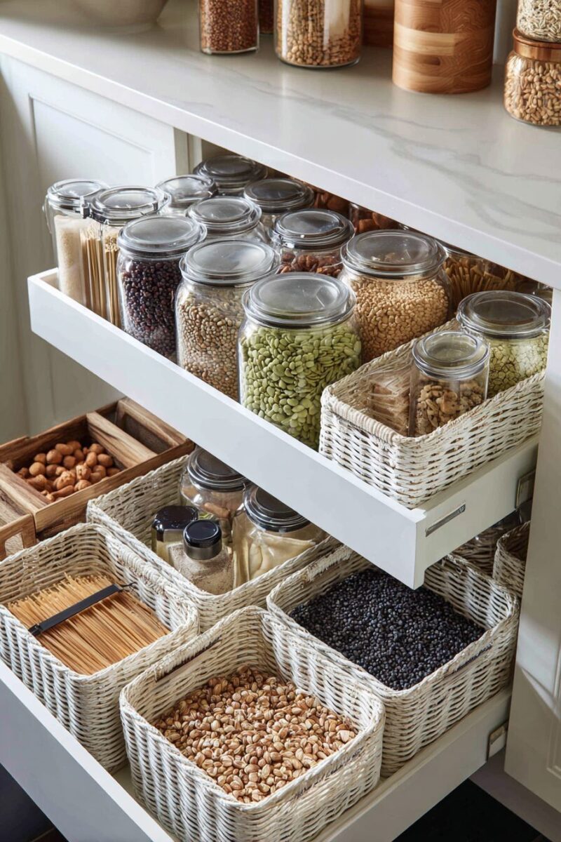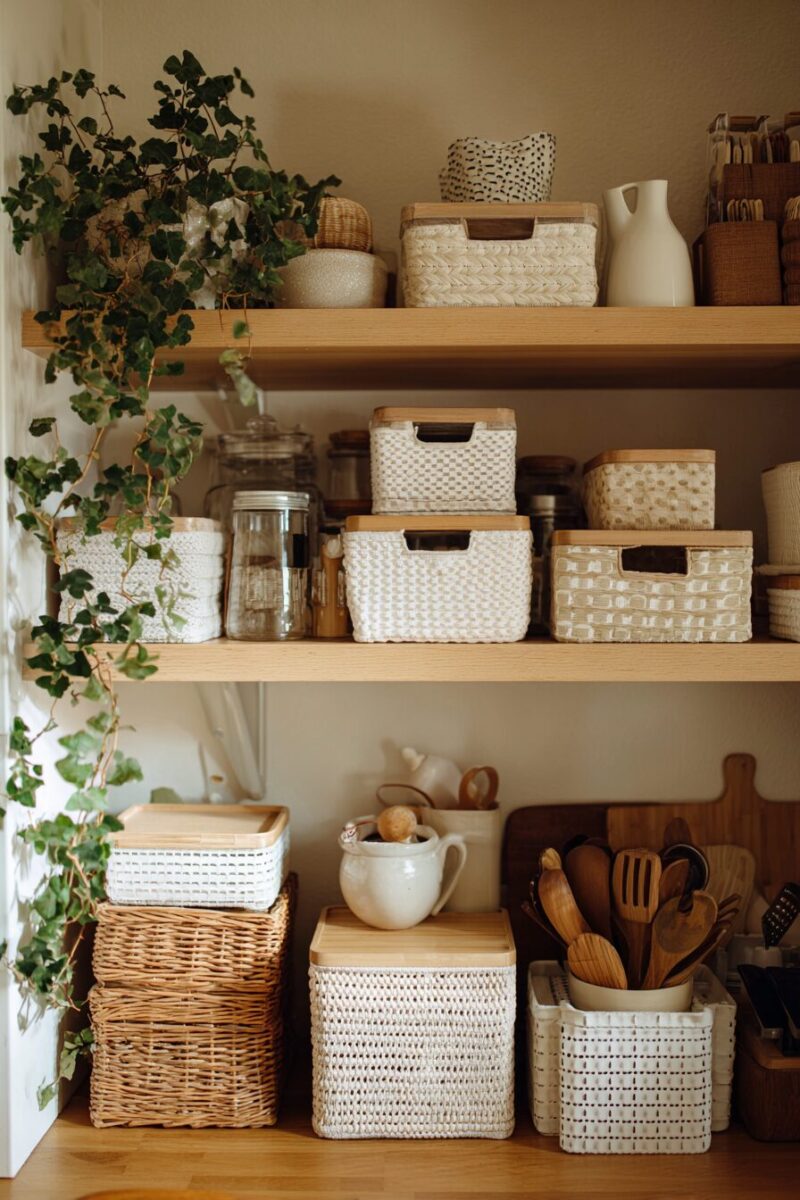 Replace traditional pantry shelves with pull-out baskets made from natural materials like bamboo or light wood.