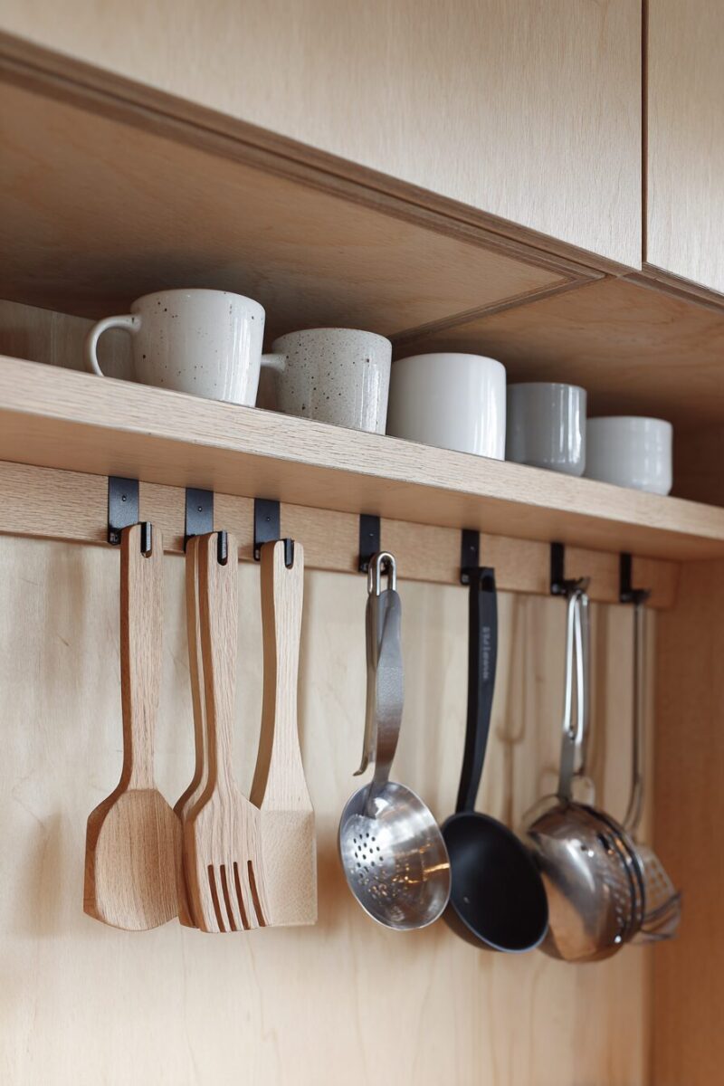 The result is a storage system that keeps metal tools organized and accessible while contributing to the overall design aesthetic of your kitchen.