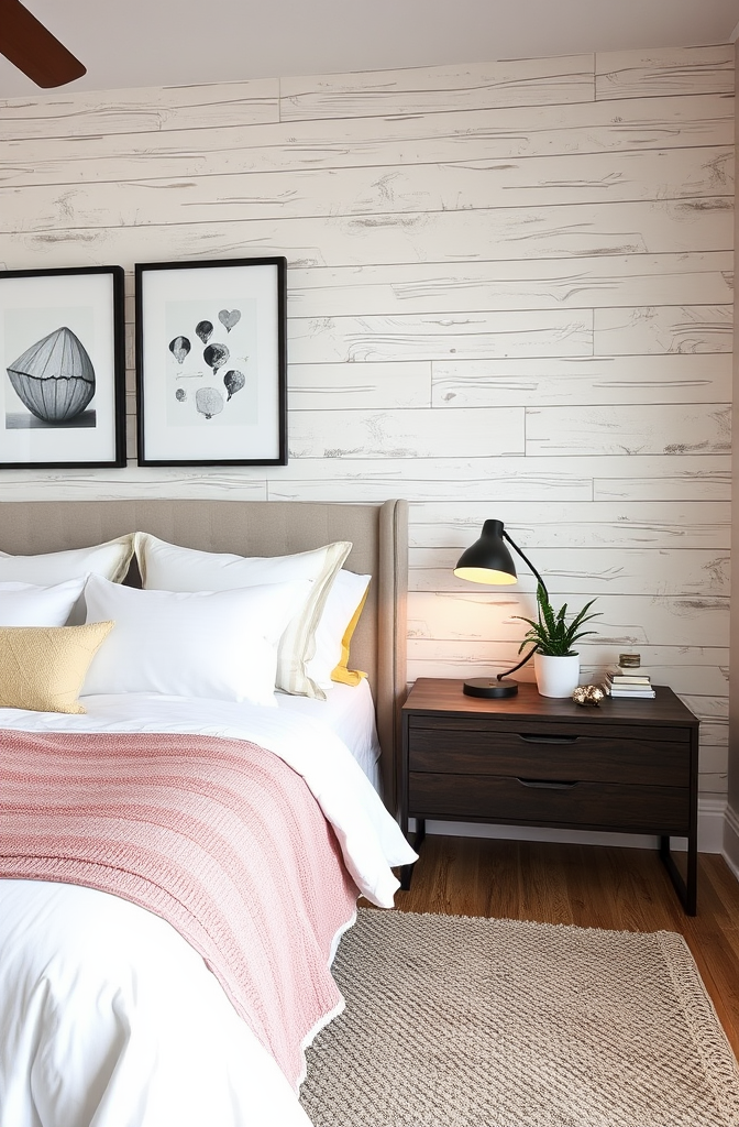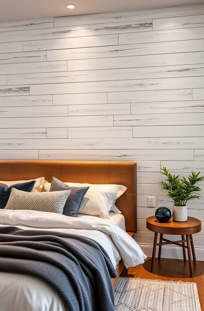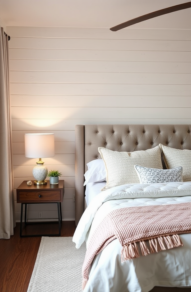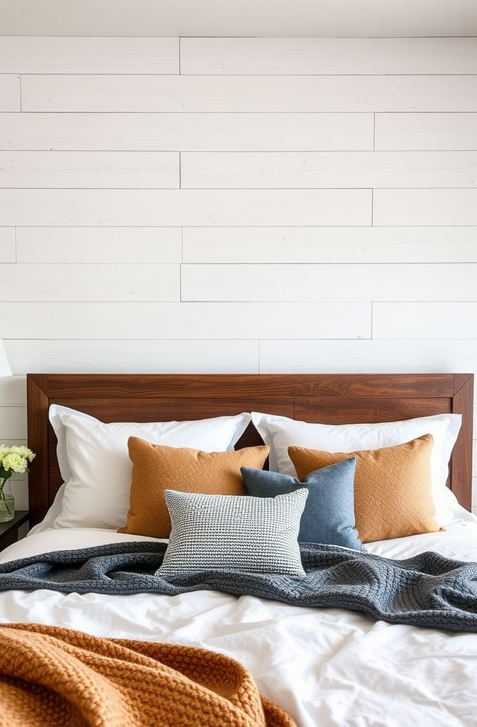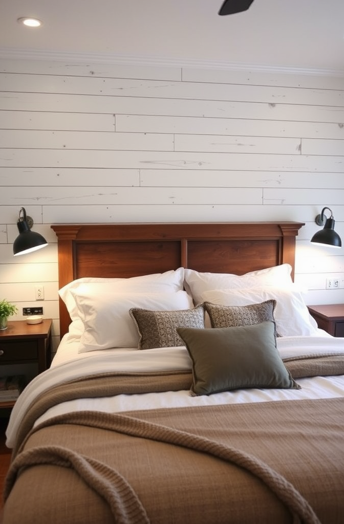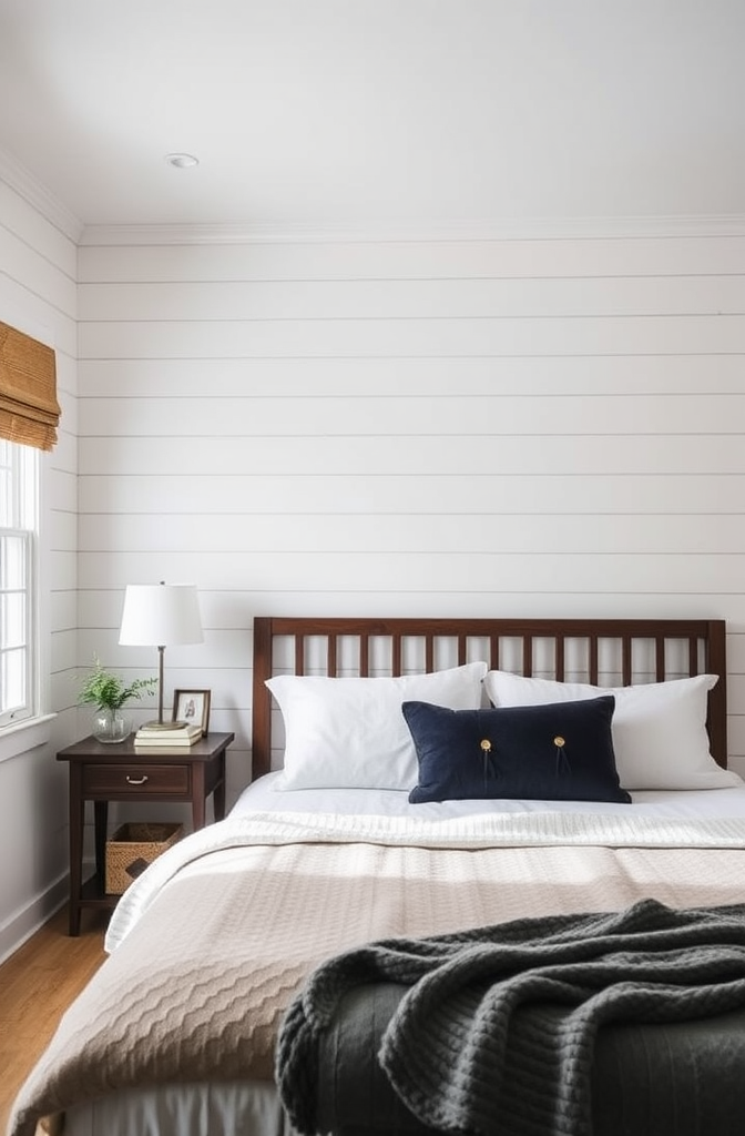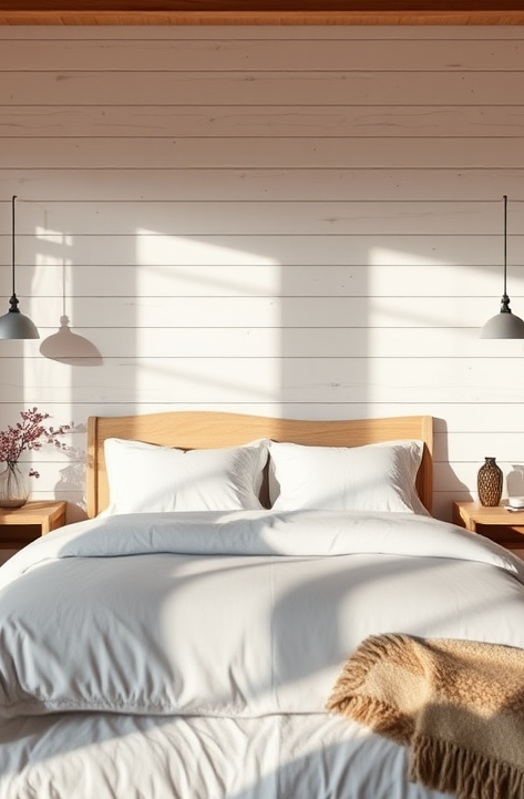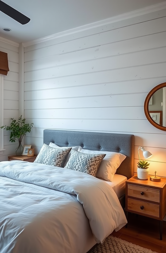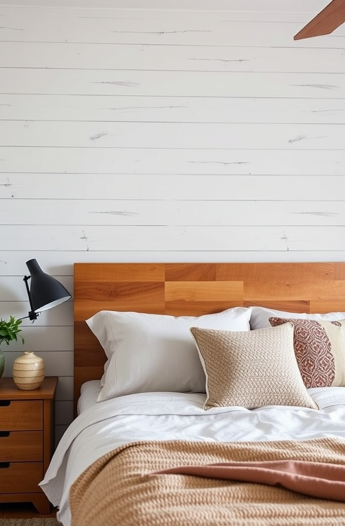 A shiplap installation behind your bed instantly creates a custom backdrop that outshines store-bought headboards.