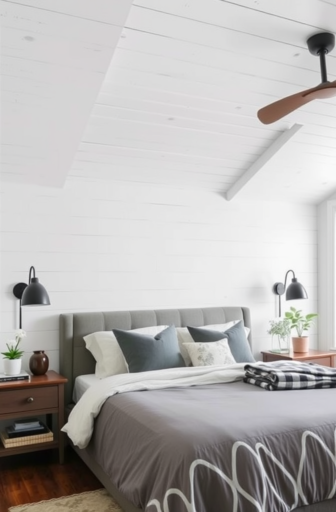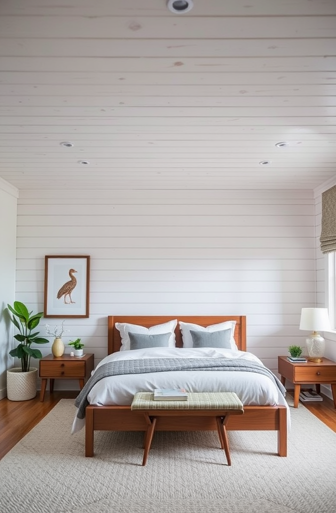 In smaller bedrooms, painting vertical shiplap the same color as your ceiling creates a continuous visual flow that removes visual boundaries.