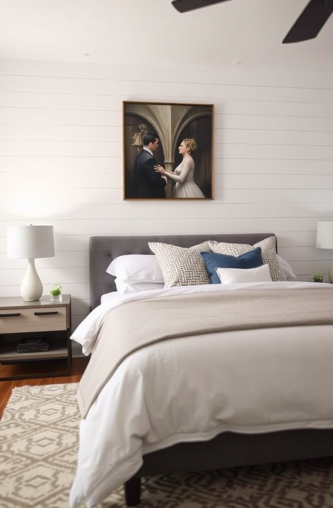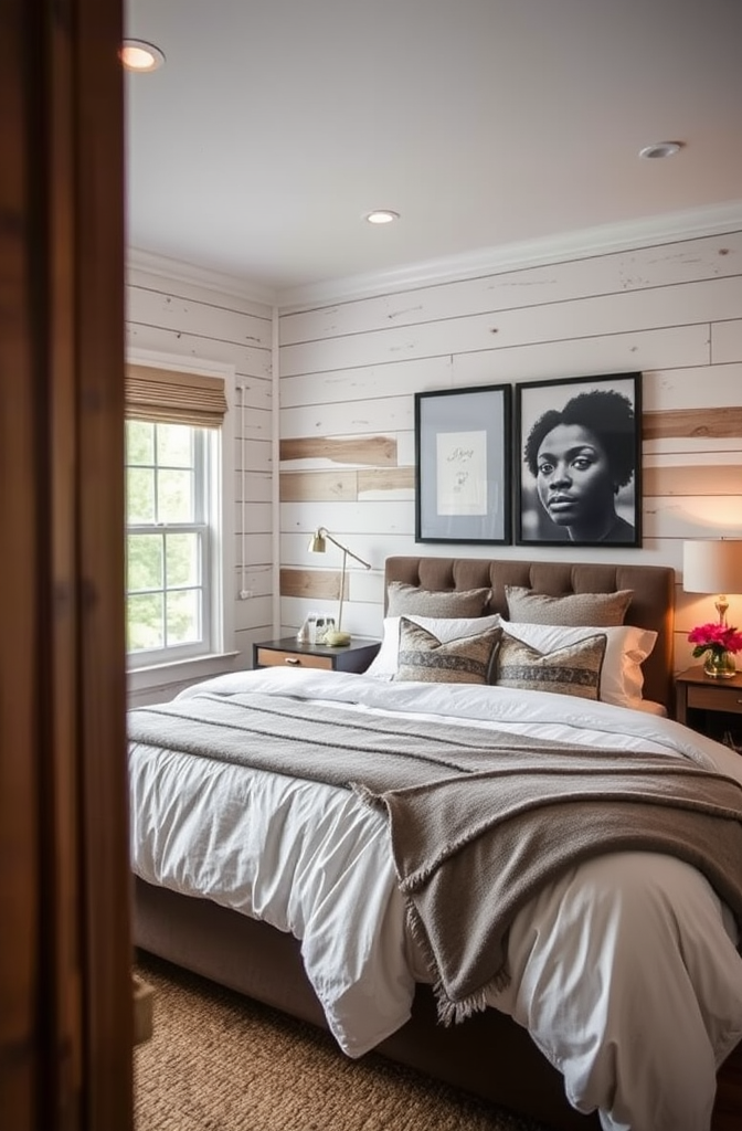 The horizontal boundary created by ending shiplap mid-wall adds an architectural detail that basic drywall bedrooms typically lack.