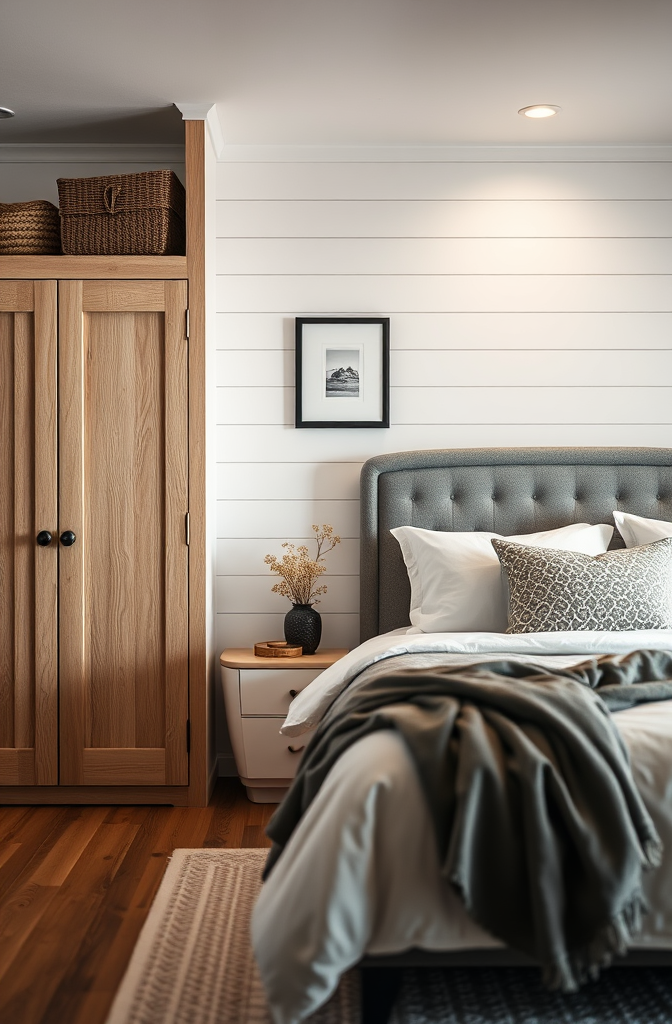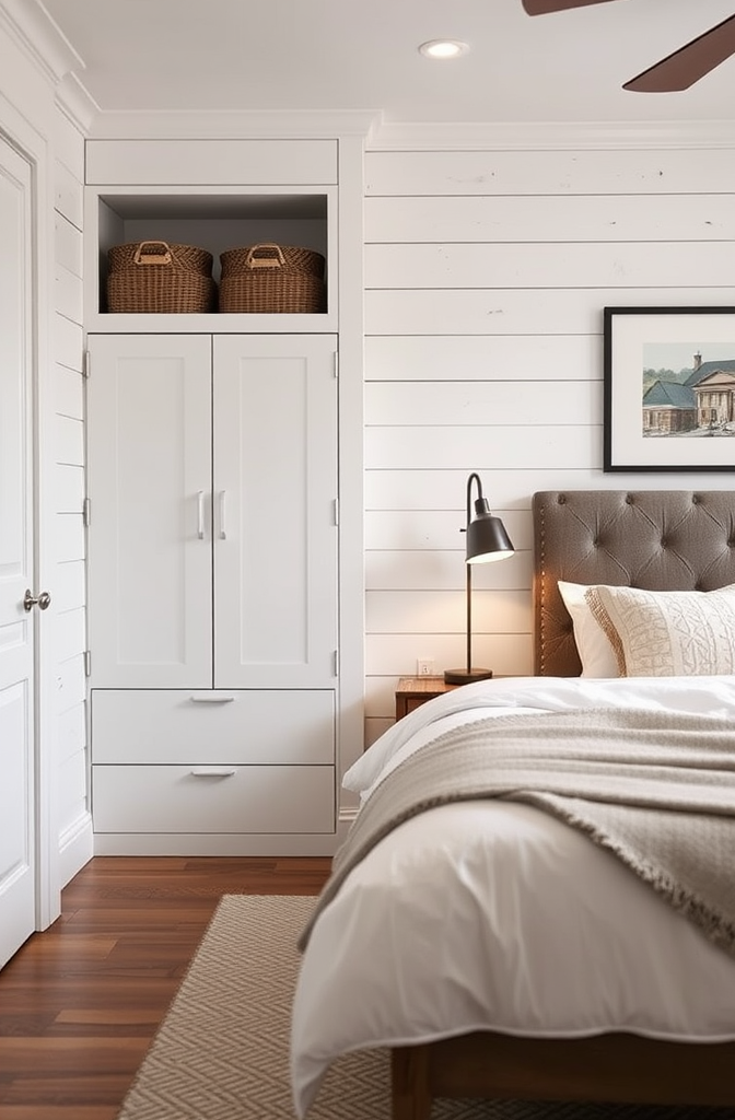 For smaller bedrooms, shiplap built-ins painted the same color as surrounding walls create storage that visually recedes rather than dominates.