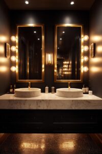 This combination works particularly well in bathrooms with darker or jewel-toned color schemes.