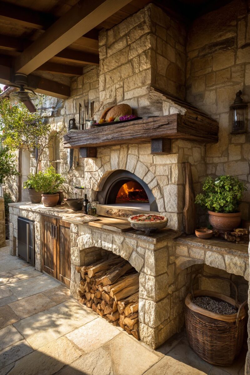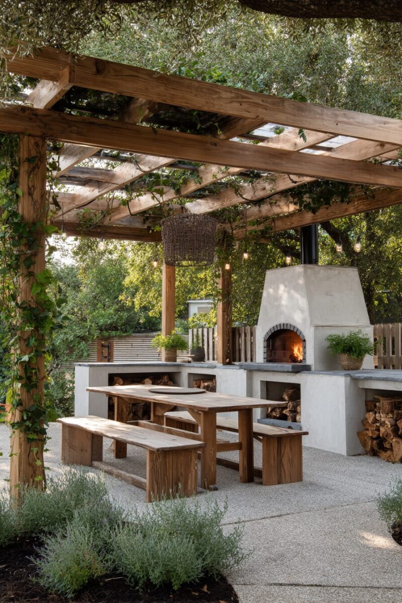 Wood storage is another consideration – decorative wood storage not only keeps cooking fuel accessible but adds to the rustic aesthetic.