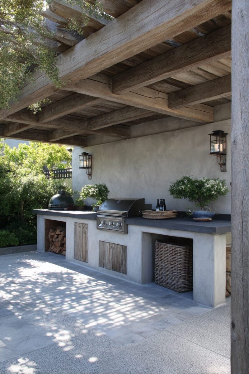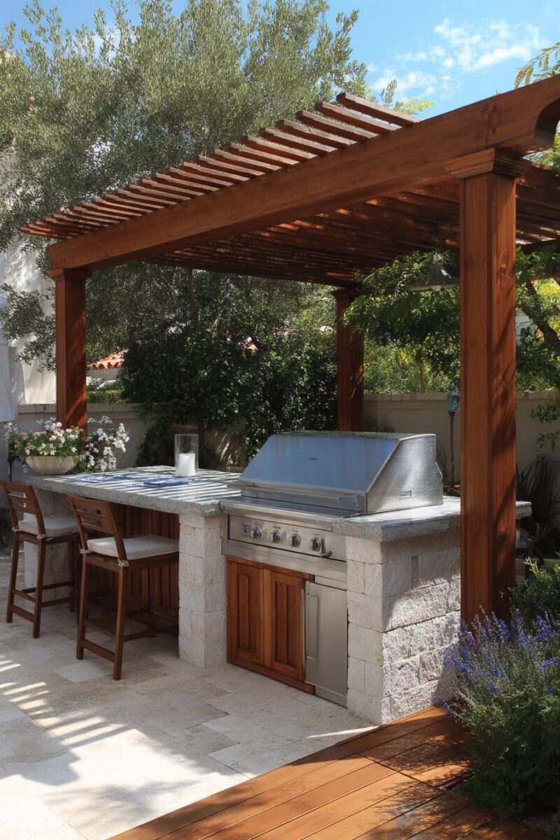 Pergolas offer a middle ground, providing filtered sunlight while creating a defined architectural space for your outdoor kitchen.