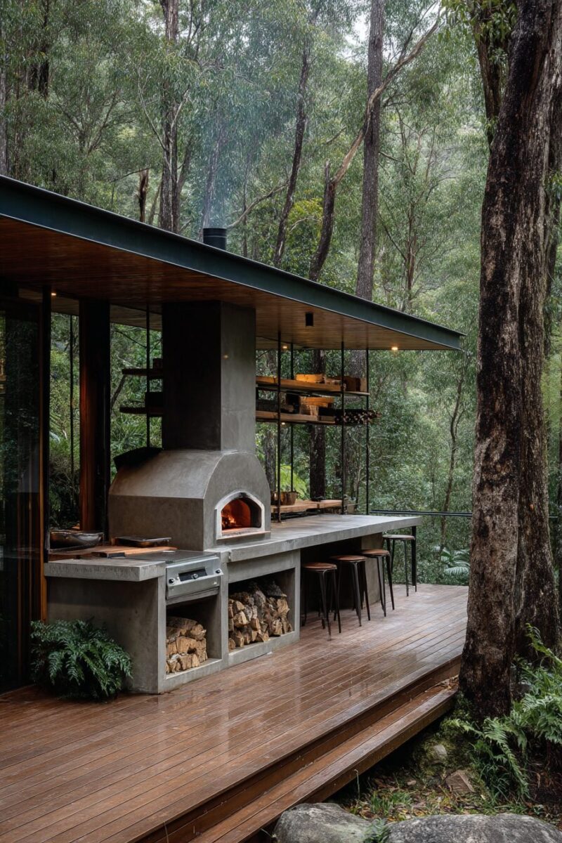 Incorporate wooden elements like cedar shelving or a butcher block section to soften the hardness of an all-masonry cooking space.