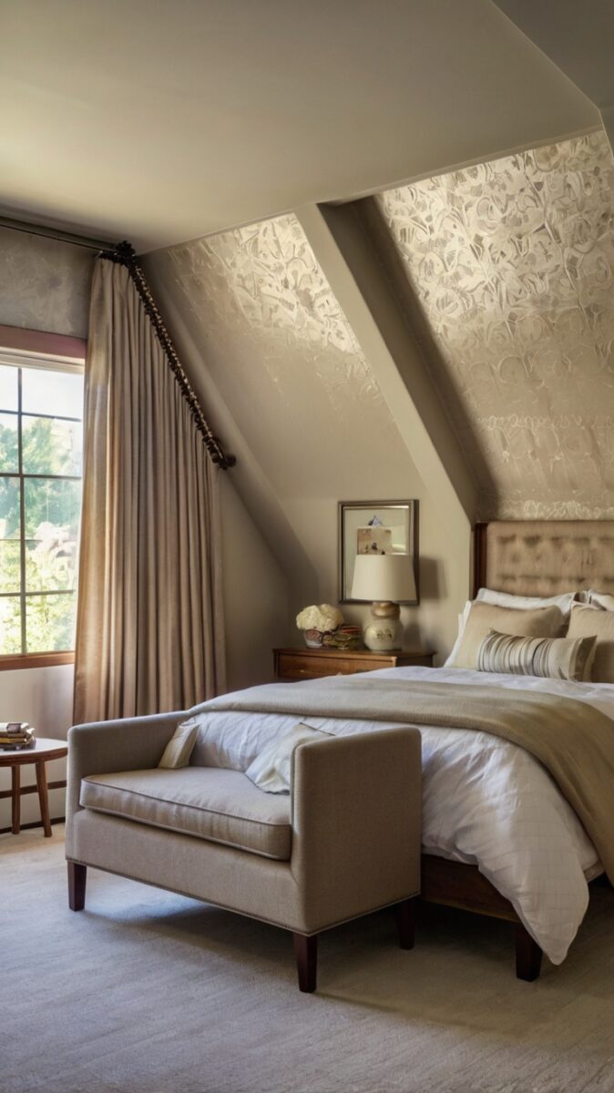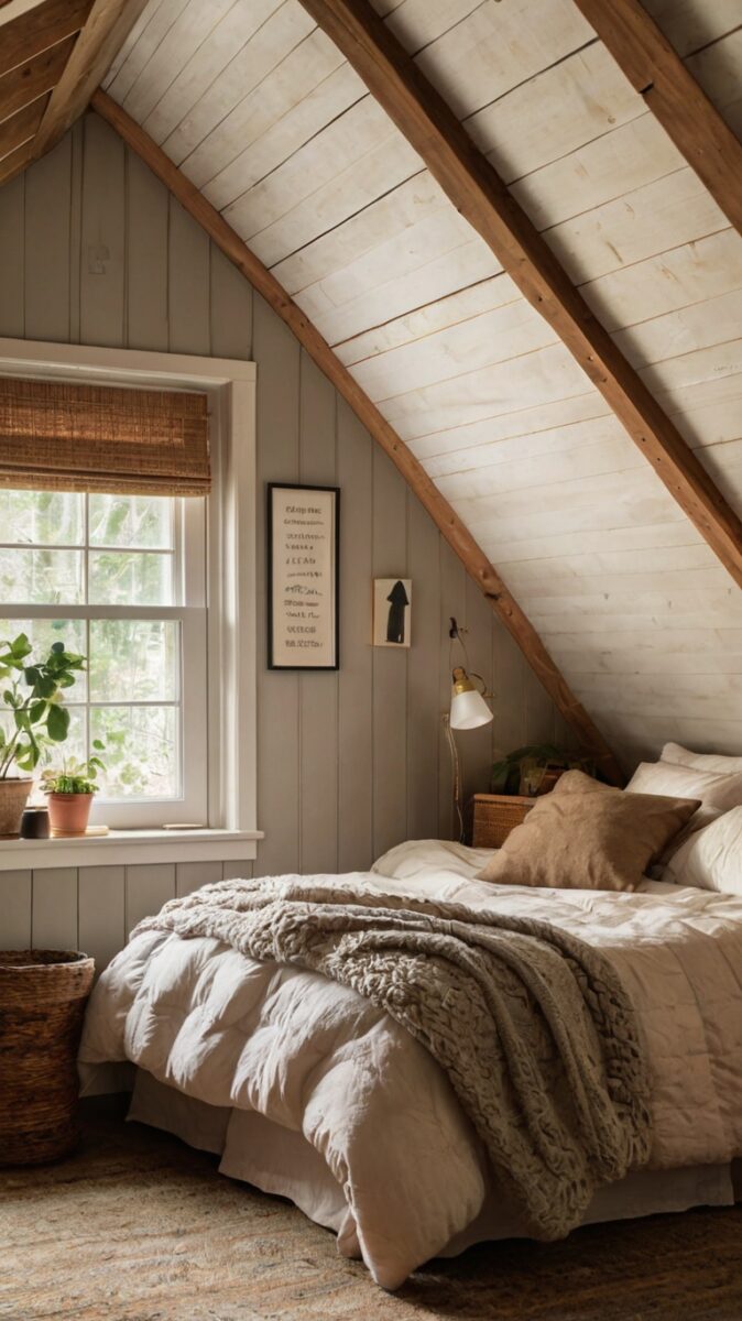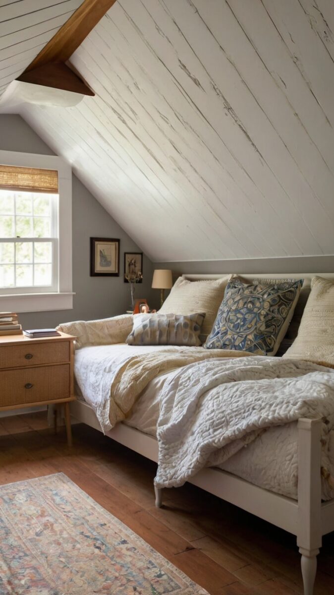 Your sloped ceiling bedroom already has that built-in cozy feeling, so lean into it.