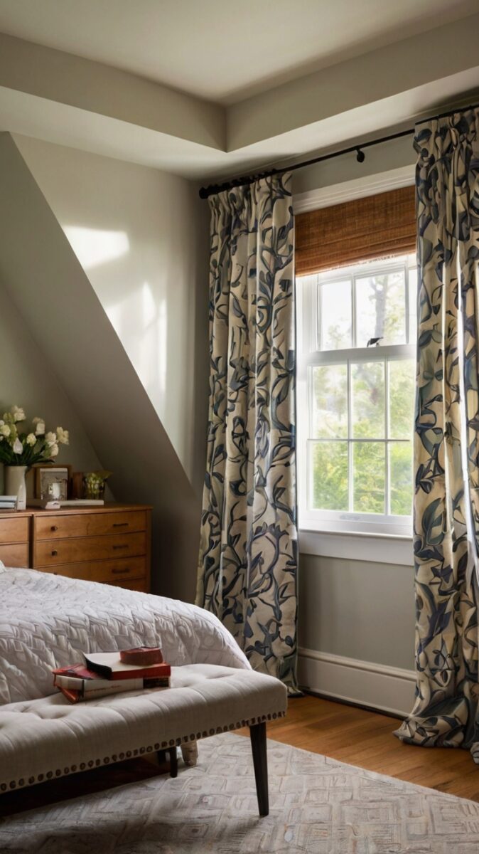 If I had a sloped ceiling bedroom with a small window, Iβd add floor-length curtains to draw the eye up and down.