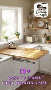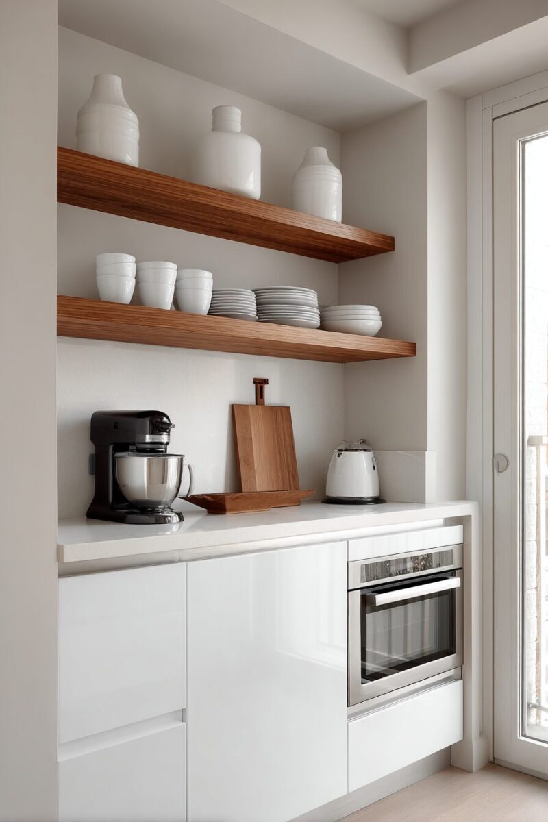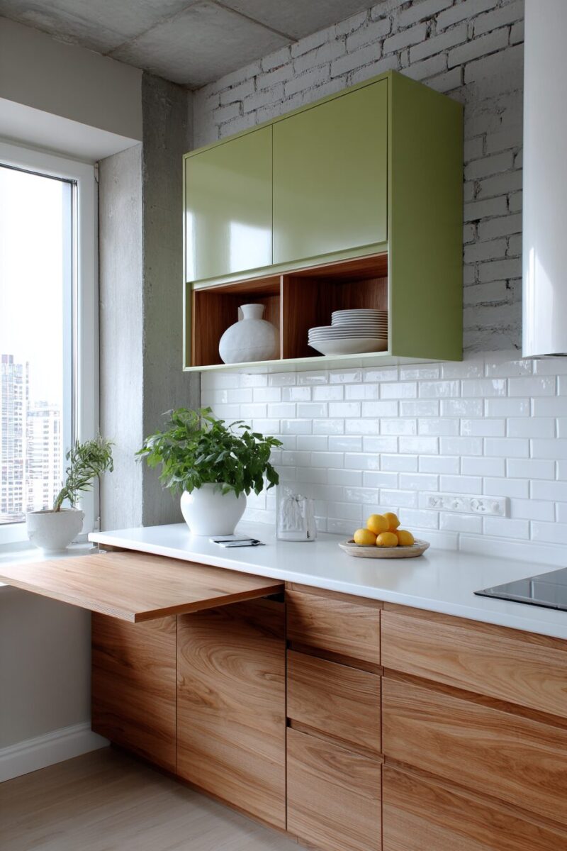 Cabinet-mounted fold-down shelves can create temporary display areas for cookbooks or serving pieces during special occasions.