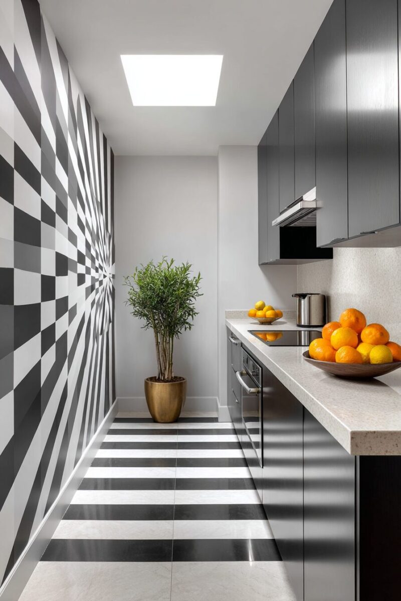 Choose horizontally-striped patterns for rugs or chair cushions to visually widen narrow kitchen layouts.