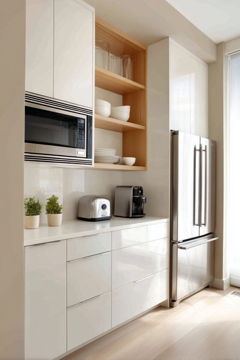 Small appliance garages with roll-up doors can be built into the space between counter and cabinets, keeping toasters and coffee makers accessible but concealed.