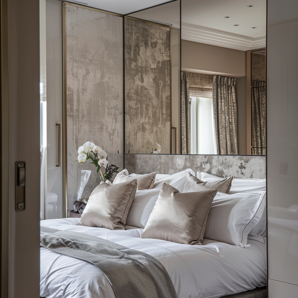 The striking shimmer coupled with mirrored surfaces helps even the darkest bedroom feel bright and expansive.