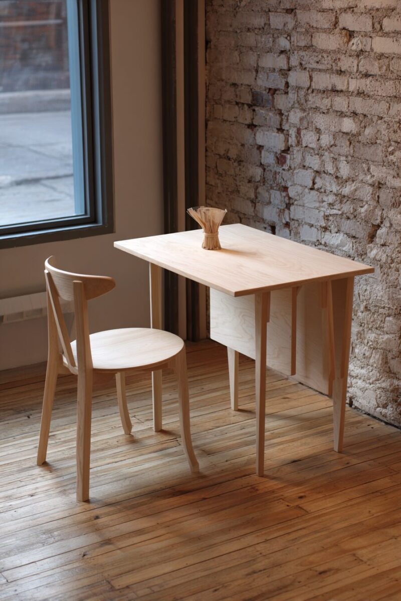 Pair your fold-down table with stackable chairs or stools that can be stored in a closet or under a bed when the table is folded up, maintaining that completely clear floor space aesthetic.