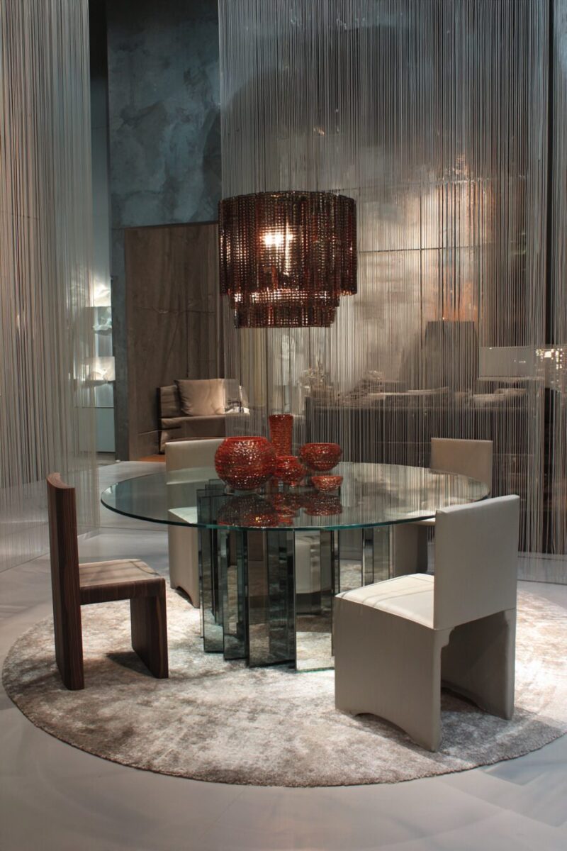 For small spaces, oval or round glass tables work particularly well since the curved edges are less visually aggressive than sharp rectangular corners.