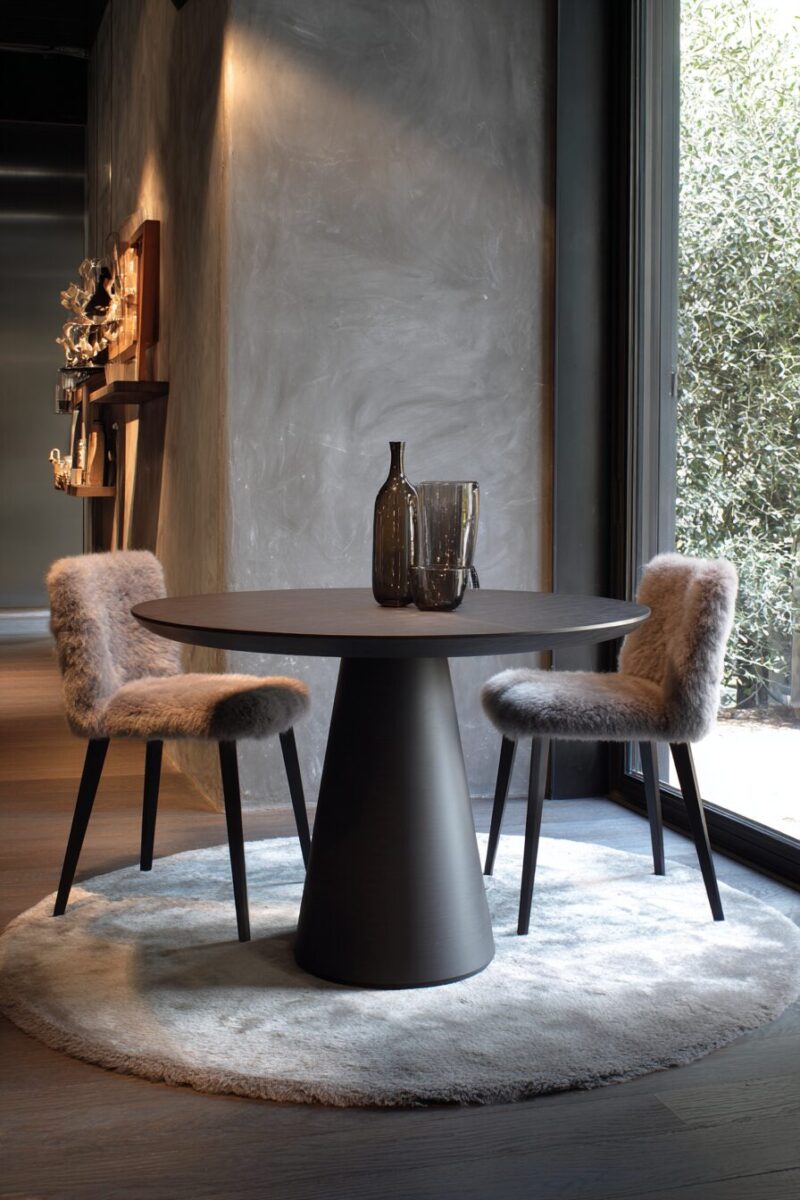 The beauty of round tables is their ability to work in unconventional spaces – tuck one into a corner with a curved banquette, place it in a bay window, or float it in the center of an open-plan living area.
